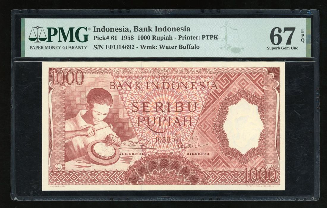 Bank Indonesia, 1000 rupiah, 1958, serial number EFU14692, (Pick 61), PMG 67EPQ Superb Gem Uncirculated, the second highest grade in PMG population report, only 2 notes are graded higher at 68EPQ.