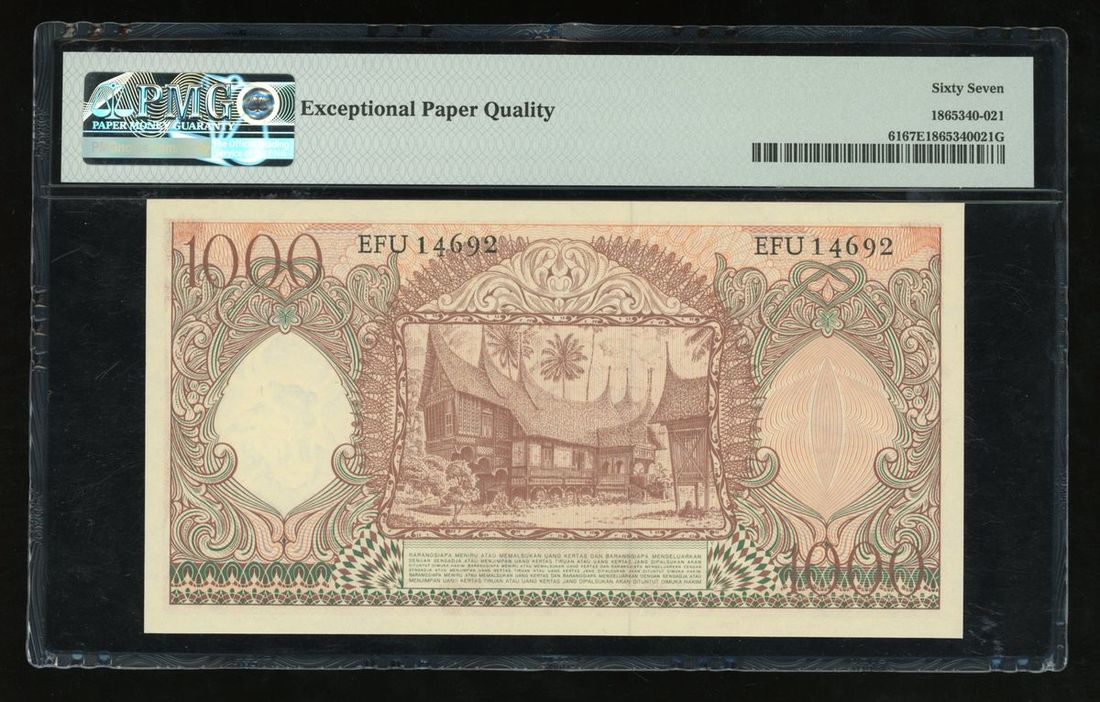 1958年印尼1000盾, 編號 EFU14692, PMG 67EPQ. PMG記錄亞軍分, 僅2枚獲更高評分68EPQ