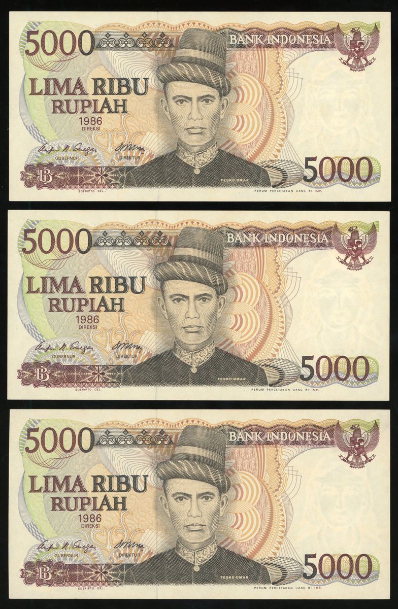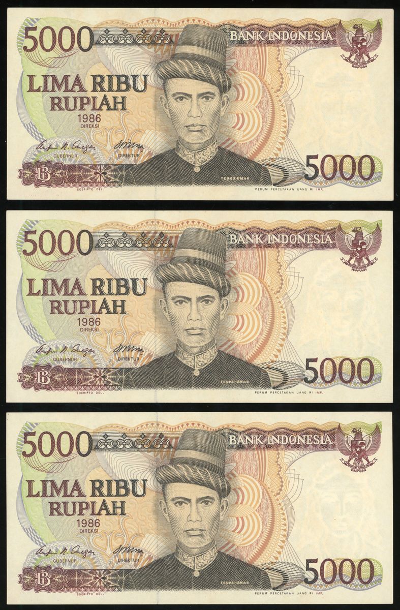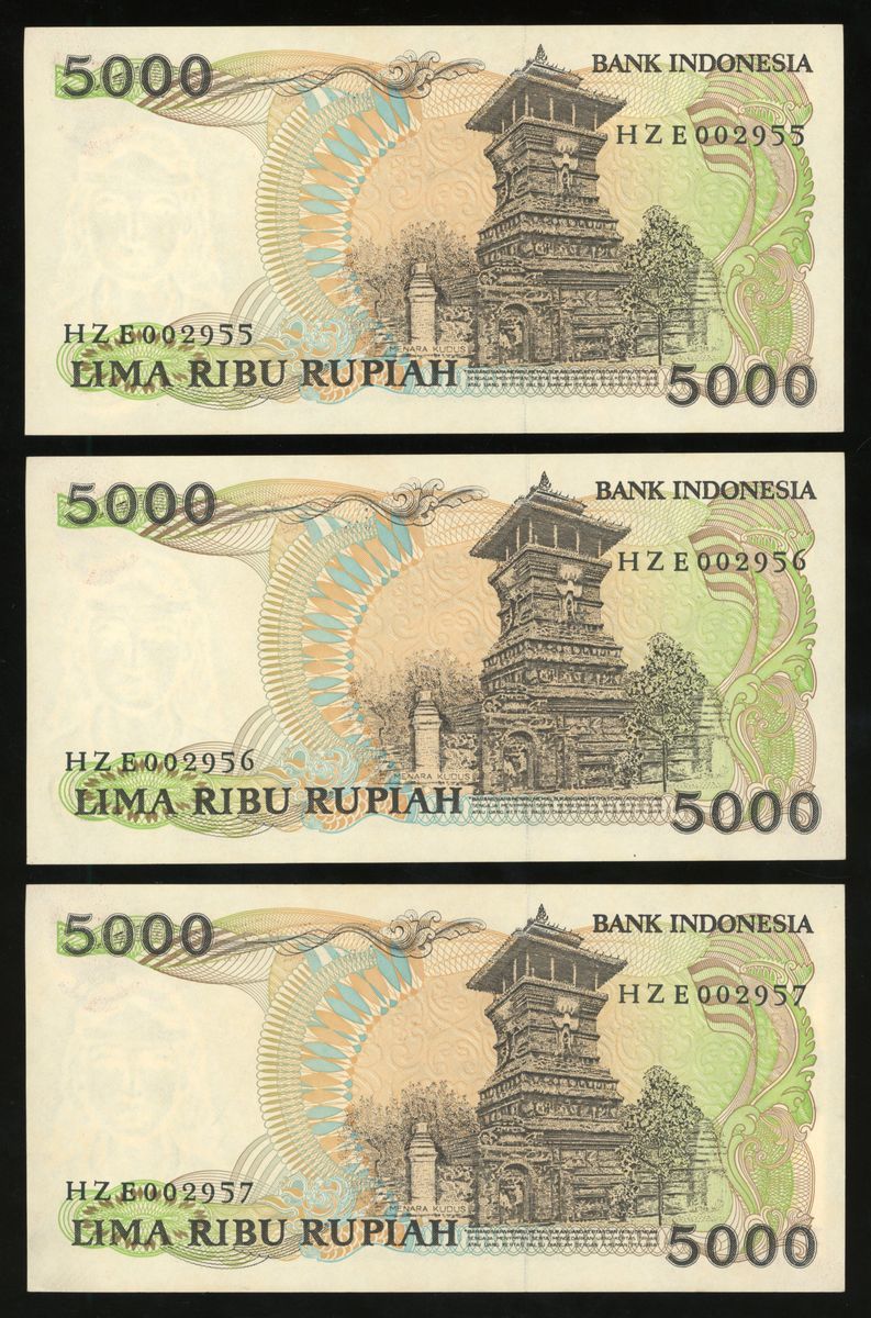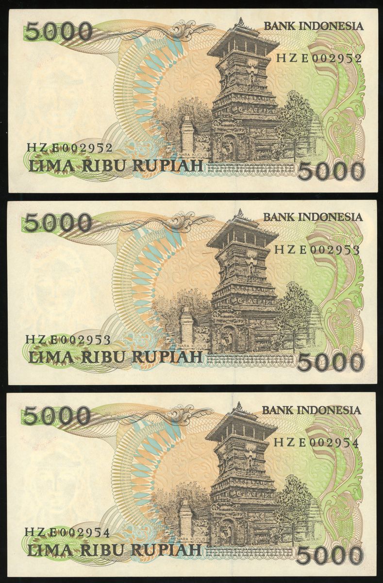 Bank Indonesia, a consecutive group of 6x 5000 rupiah, 1986, serial numbers HZE002952-57, (Pick 125), all about uncirculated, with mild foxing (6).