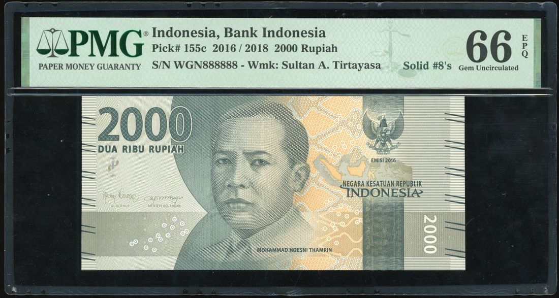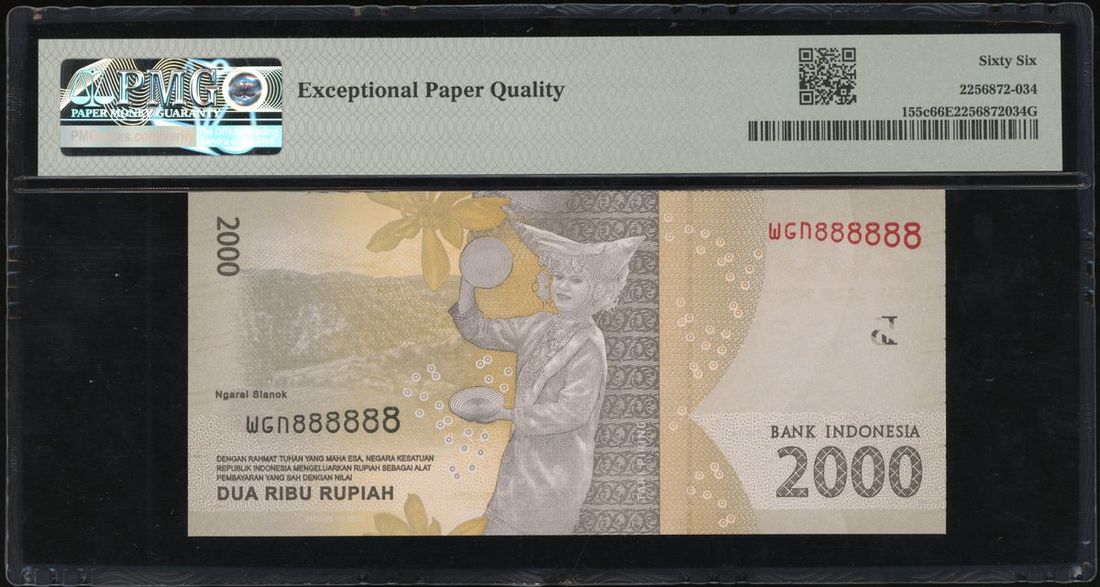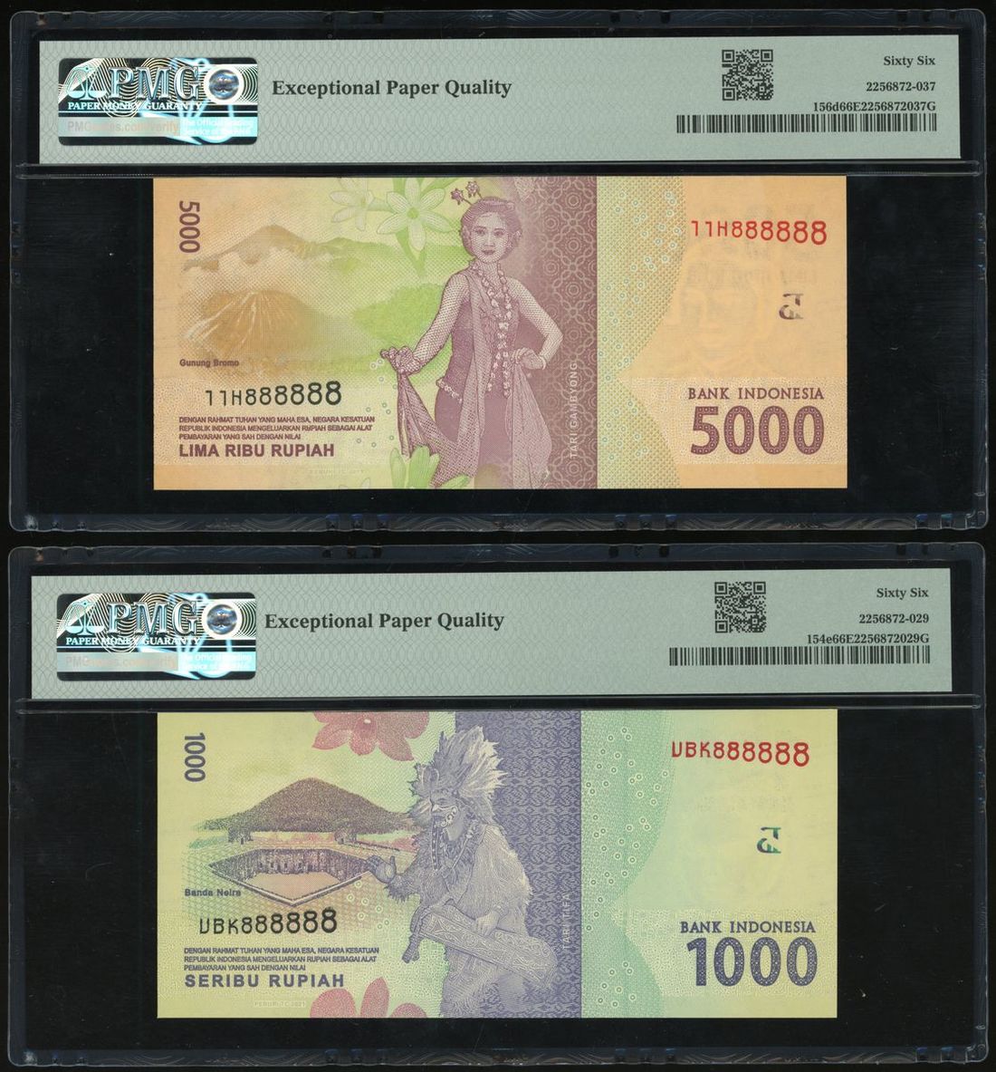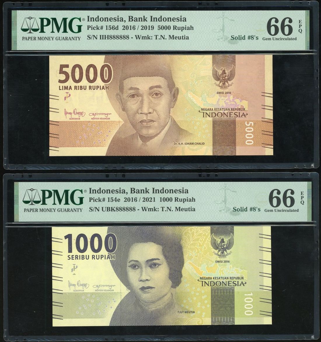 Bank Indonesia, a group of 3 notes matching serial number 888888, consists of 1000, 2000 and 5000 rupiah, 2018-2021, different prefixes UBK/WGN/IIH, (Pick 154e, 155c and 156d), all graded PMG 66PEQ Gem Uncirculated (3).