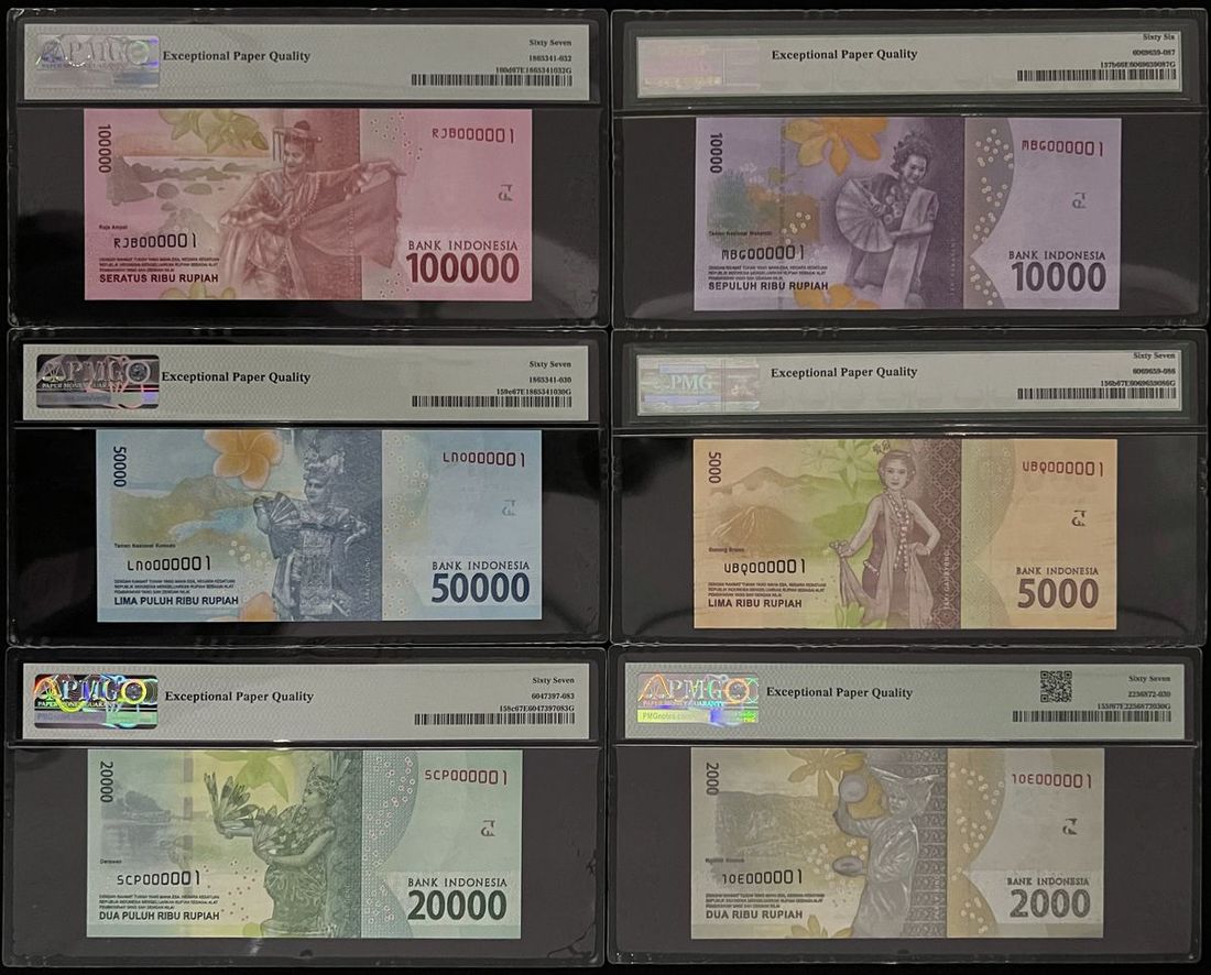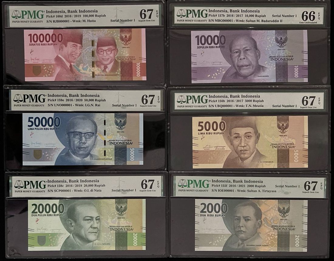 Bank Indonesia, a group of 6 notes matching serial number 000001, consists of 2000, 5000, 10000, 20000, 50000 and 100000 rupiah, 2016 series, different prefixes IOE/UBQ/MBG/SCP/LNO/RJB, (Pick 155f-160d), 10000 rupiah graded PMG 66EPQ and the rest 67EPQ (6).