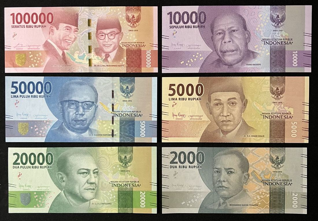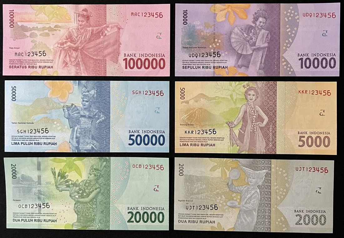 Bank Indonesia, a group of 6 notes matching serial number 123456, consists of 2000, 5000, 10000, 20000, 50000 and 100000 rupiah, 2016 series, different prefixes UJT/KKR/UDQ/OCB/SGH/MAC, (Pick 155-160), all uncirculated (6).