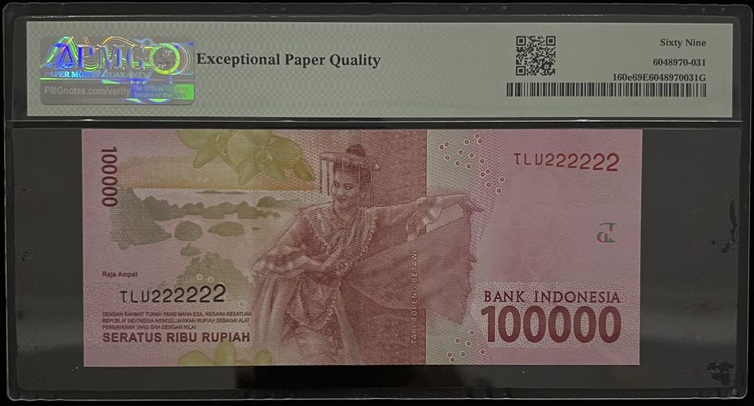 Bank Indonesia, 100000 rupiah, 2020, serial number TLV222222, (Pick 160e), PMG 69EPQ Superb Gem Uncirculated, the second highest grade in PMG population report, only 3 notes are graded higher at 70EPQ*.