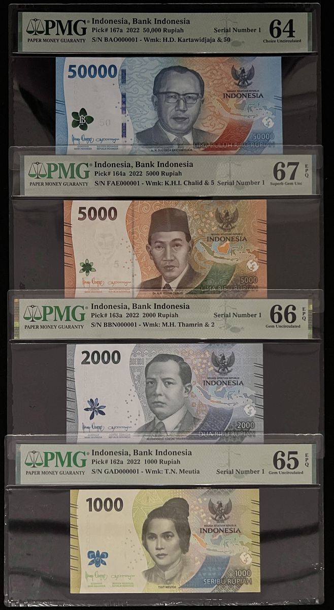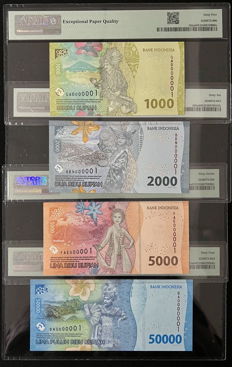 Bank Indonesia, a group of 4 notes matching serial number 000001, consists of 1000, 2000, 5000 and 50000 rupiah, 2022, different prefixes GAD/BBN/FAE/BAO, (Pick 162a, 163a, 164a and 167a), graded PMG 65EPQ, 66EPQ, 67EPQ and 64 respectively (4).