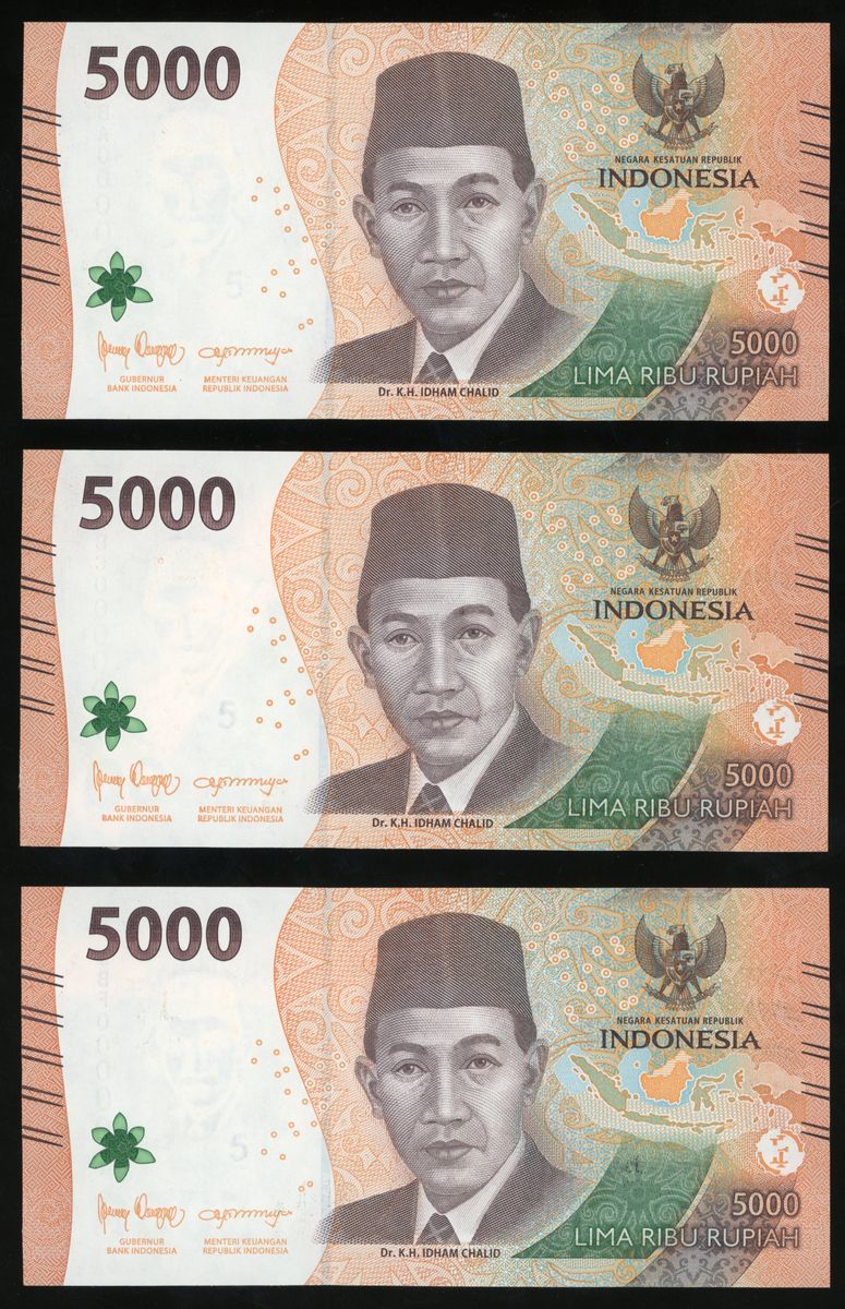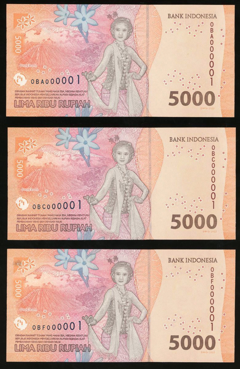 Bank Indonesia, a group of 3x 5000 rupiah, 2023, small serial numbers OBA/OBC/OBF 000001, (Pick A164), all uncirculated (3).