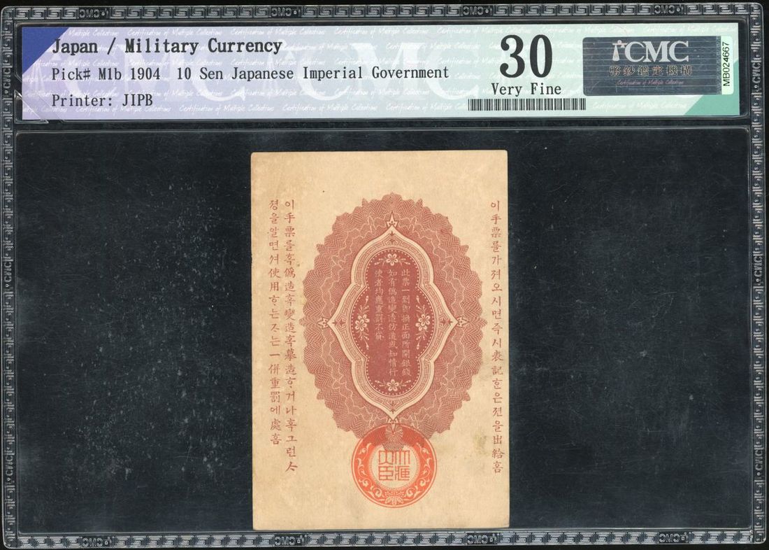 Japanese Military, 10 sen, Meiji Year 37(1904), no serial number, printed by JIPB, (Pick M1b), CMC 30 Very Fine.