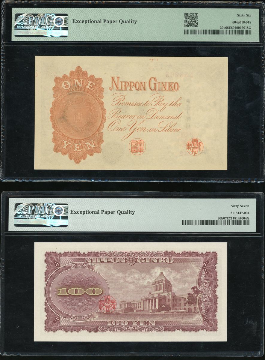 Bank of Japan, a pair of 1 yen and 100 yen, no date (1916 and 1953), serial numbers 556265 {442} and CR116465G, (Pick 30c and 90b), graded PMG 66EPQ and 67EPQ respectively (2).