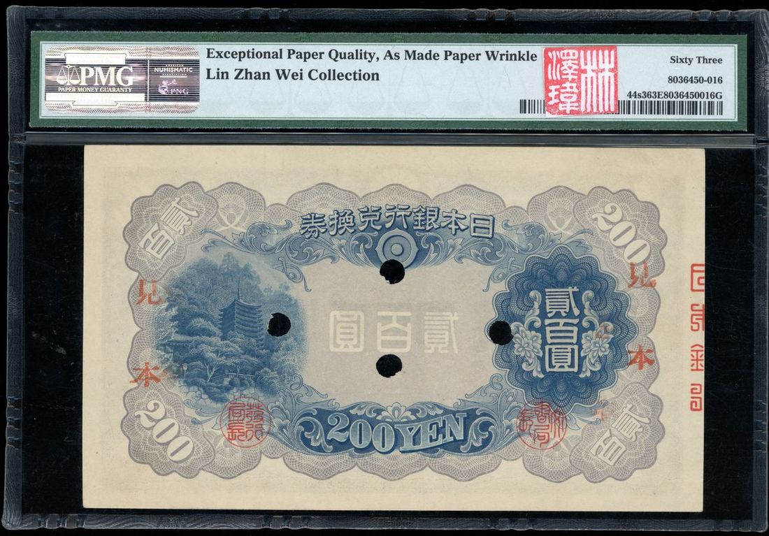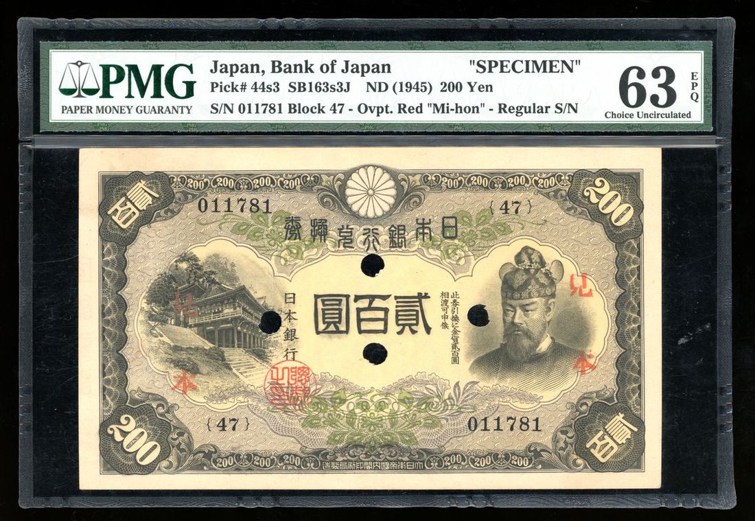 1945年日本200圓樣票, 編號 011781. PMG 63. PMG僅5枚獲更高評分