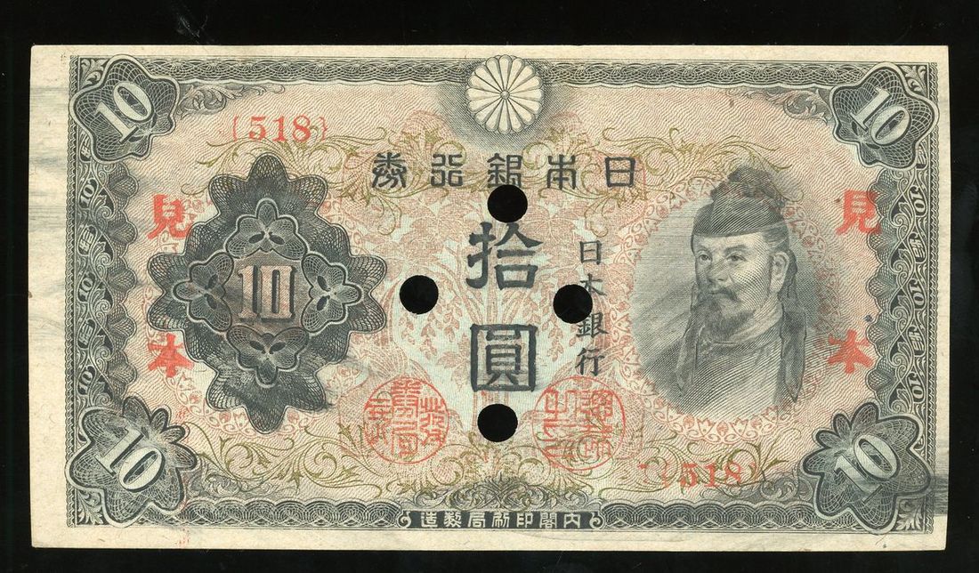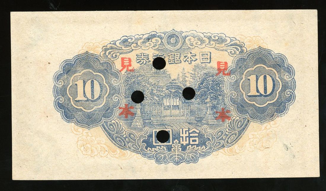Bank of Japan, SPECIMEN 10 yen, ND (1944-1945), block number 518, stamped 'Mihon' in red on obverse and reverse,