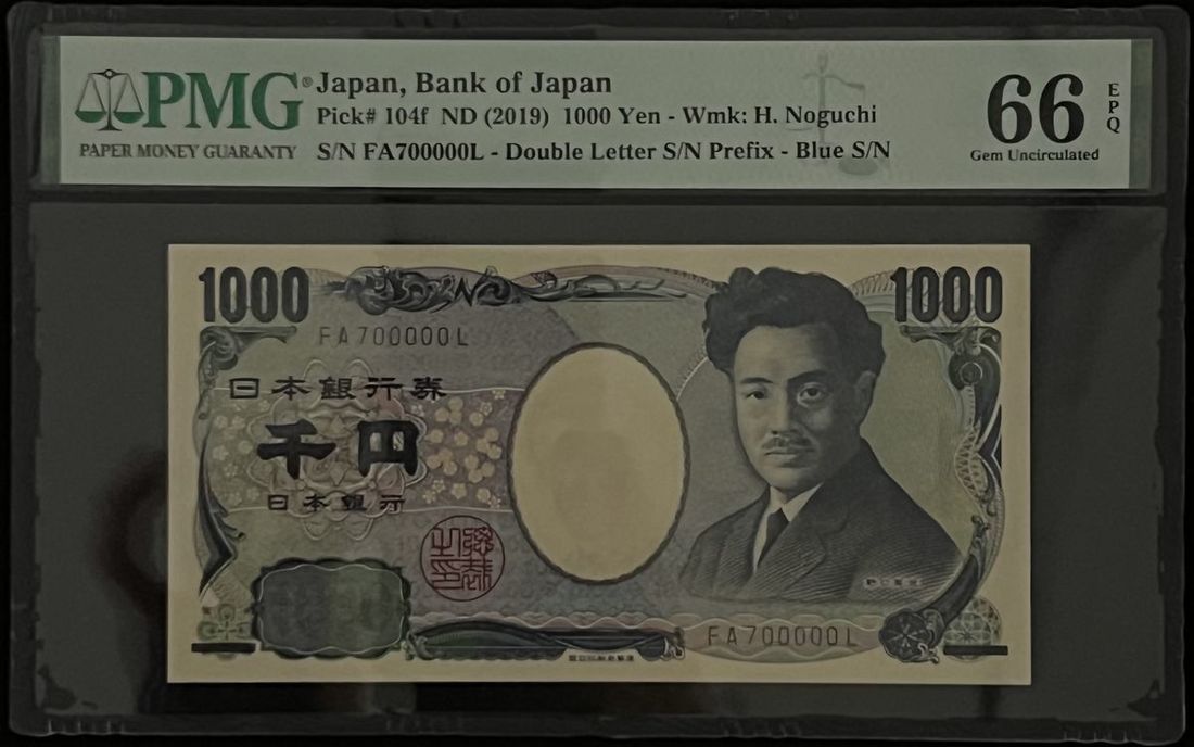 Bank of Japan, 1000 yen, no date (2019), serial number FA700000L, (Pick 104f), PMG 66EPQ Gem Uncirculated.