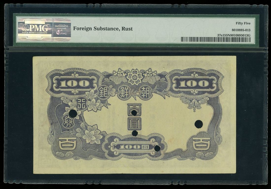 1944年韓國100圓樣票, 編號 00000, 控號 435, PMG 55NET, 有附著物, 銹漬