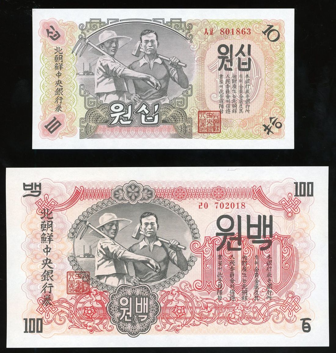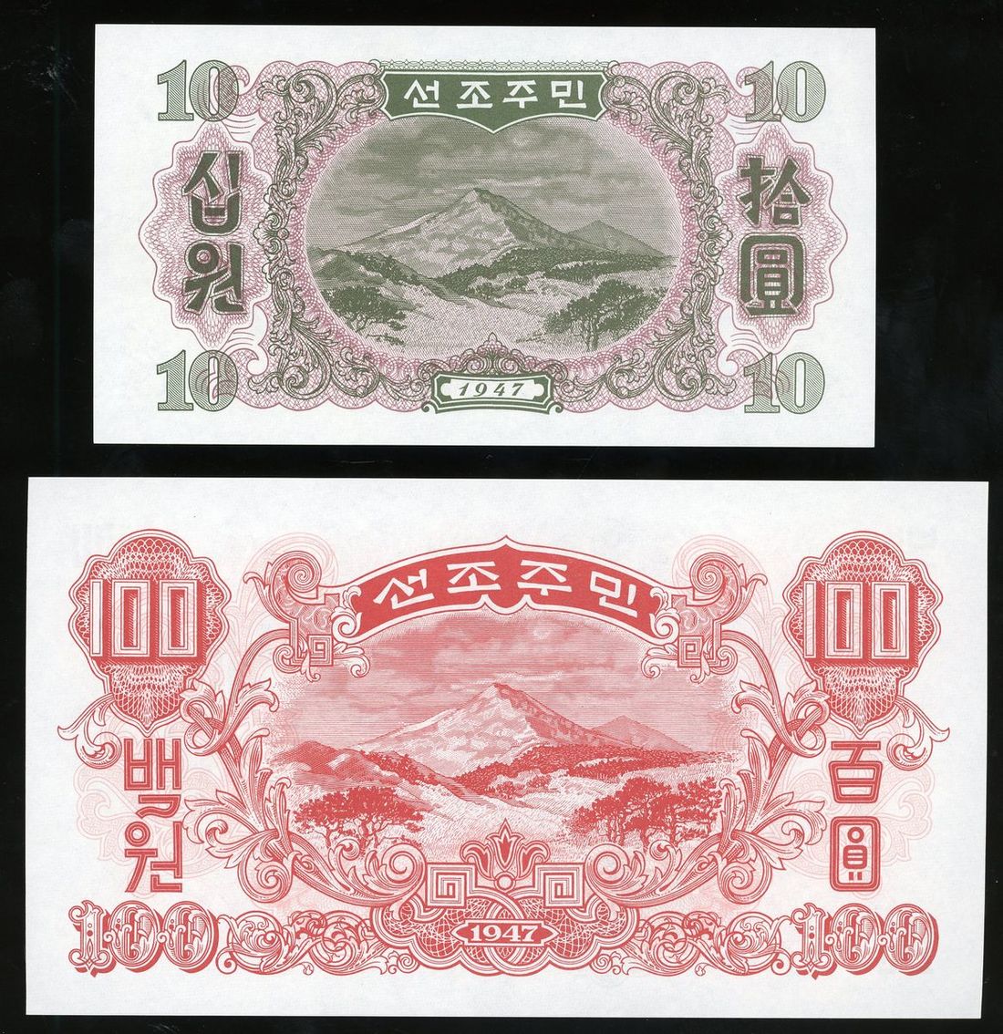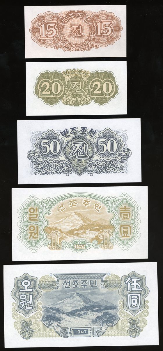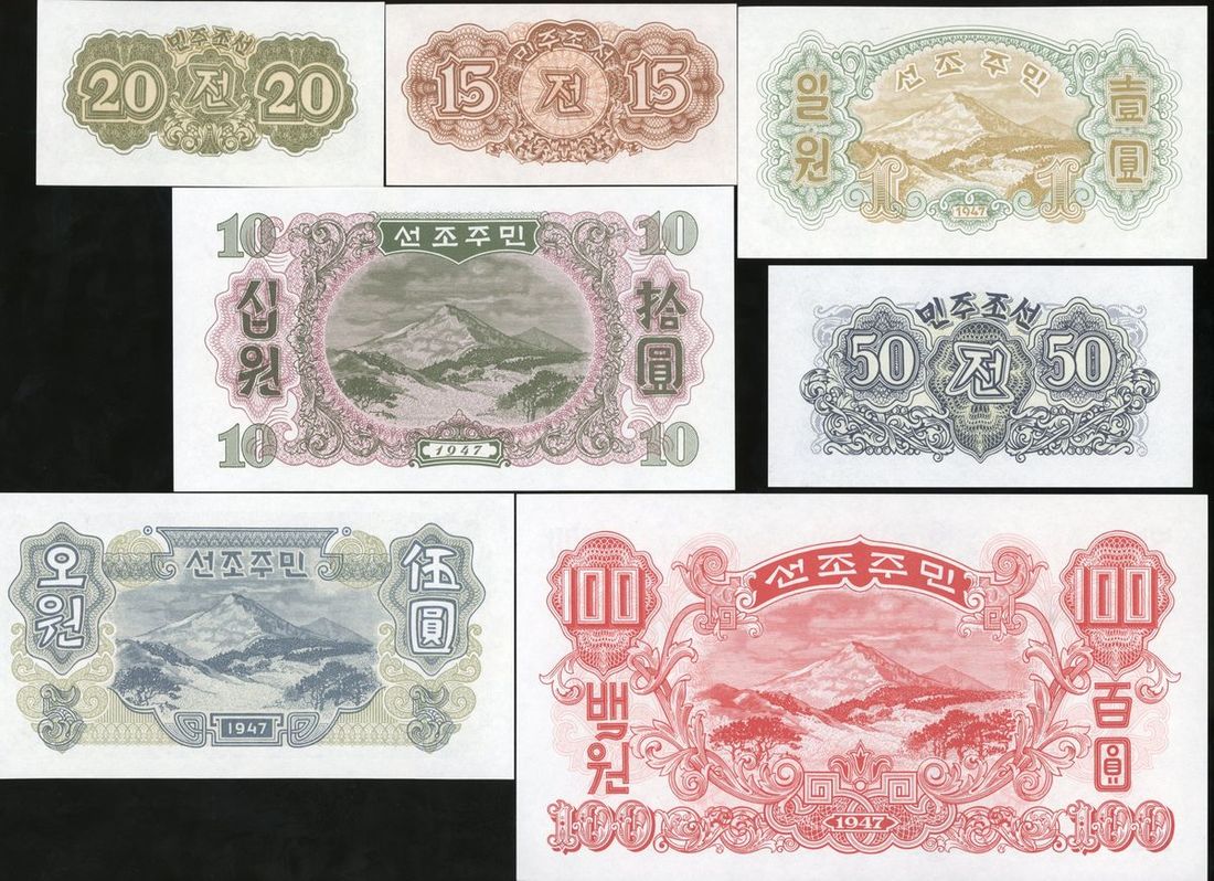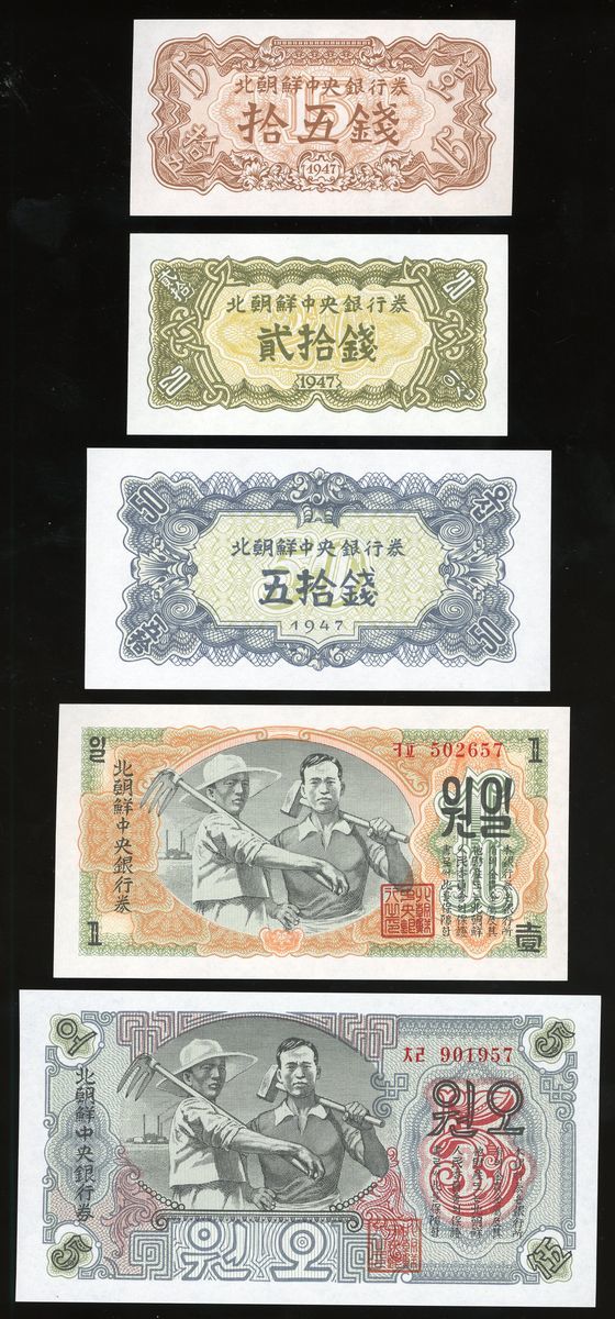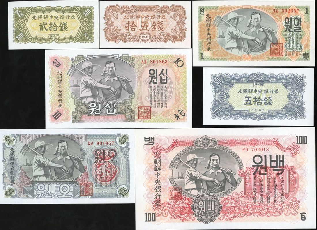 1947年北韓一組七枚, 包括15錢, 20錢, 50錢, 1圓, 5圓, 10圓及100圓. UNC品相