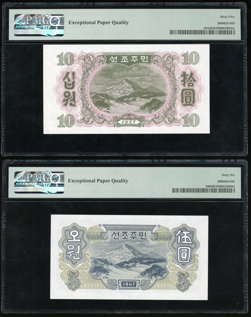 North Korea, Central Bank, a pair of 5 won and 10 won, 1947, MODERN REPRINT, serial number JN903137 and SN806006, (Pick 10b and 10A), graded PMG 66EPQ and 65EPQ Gem Uncirculated respectively (2).