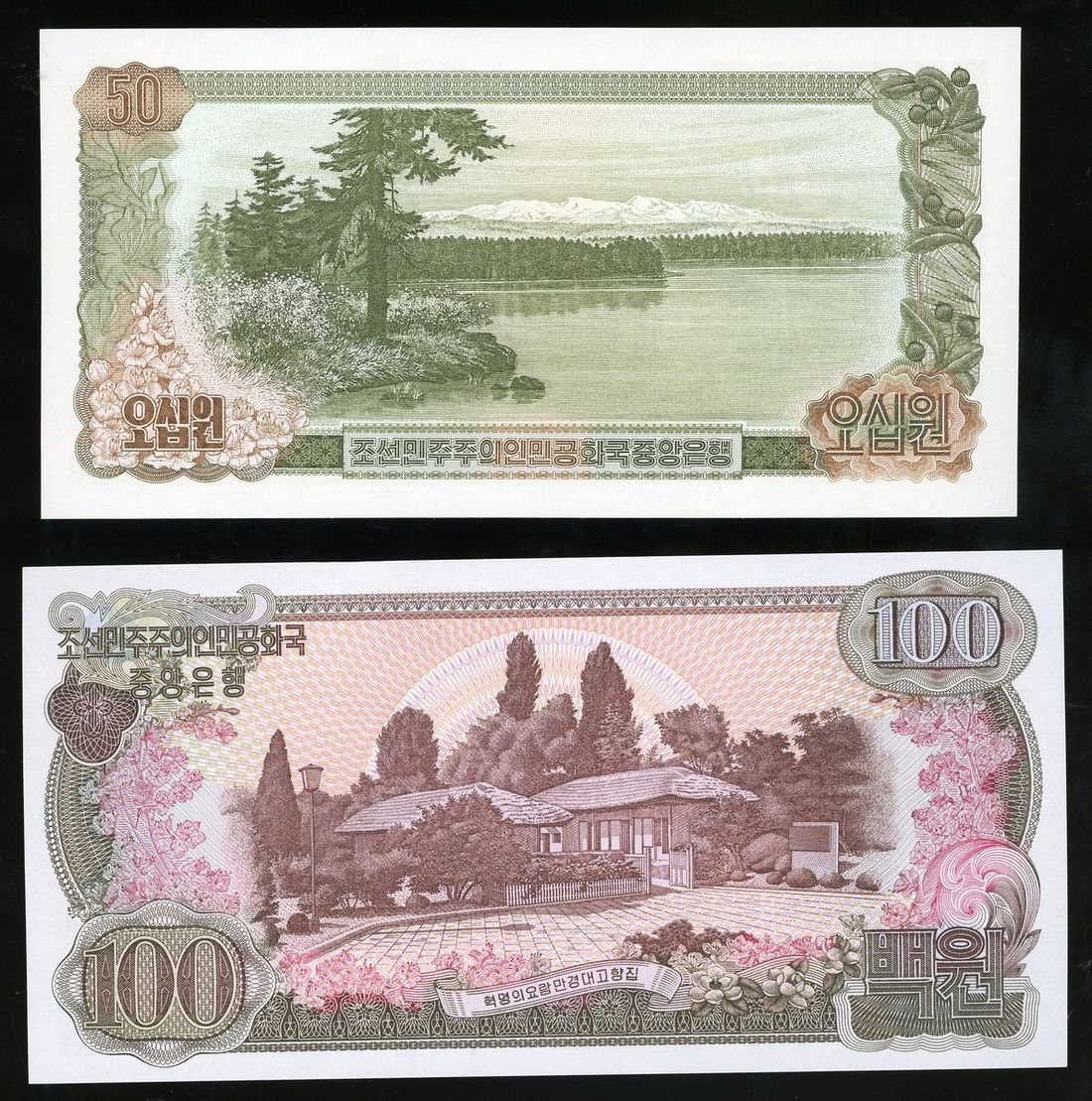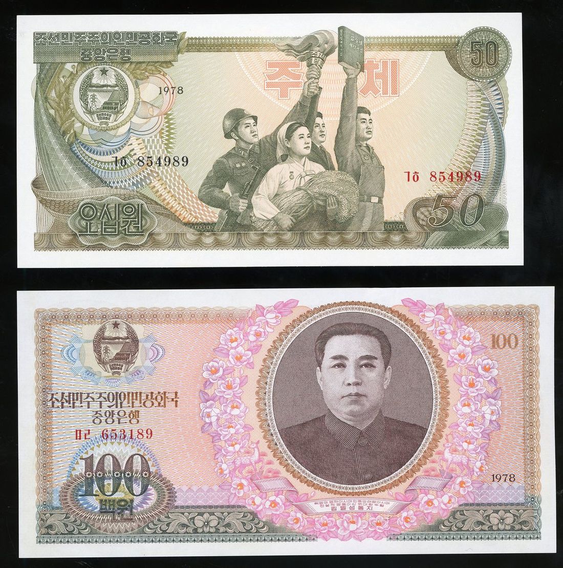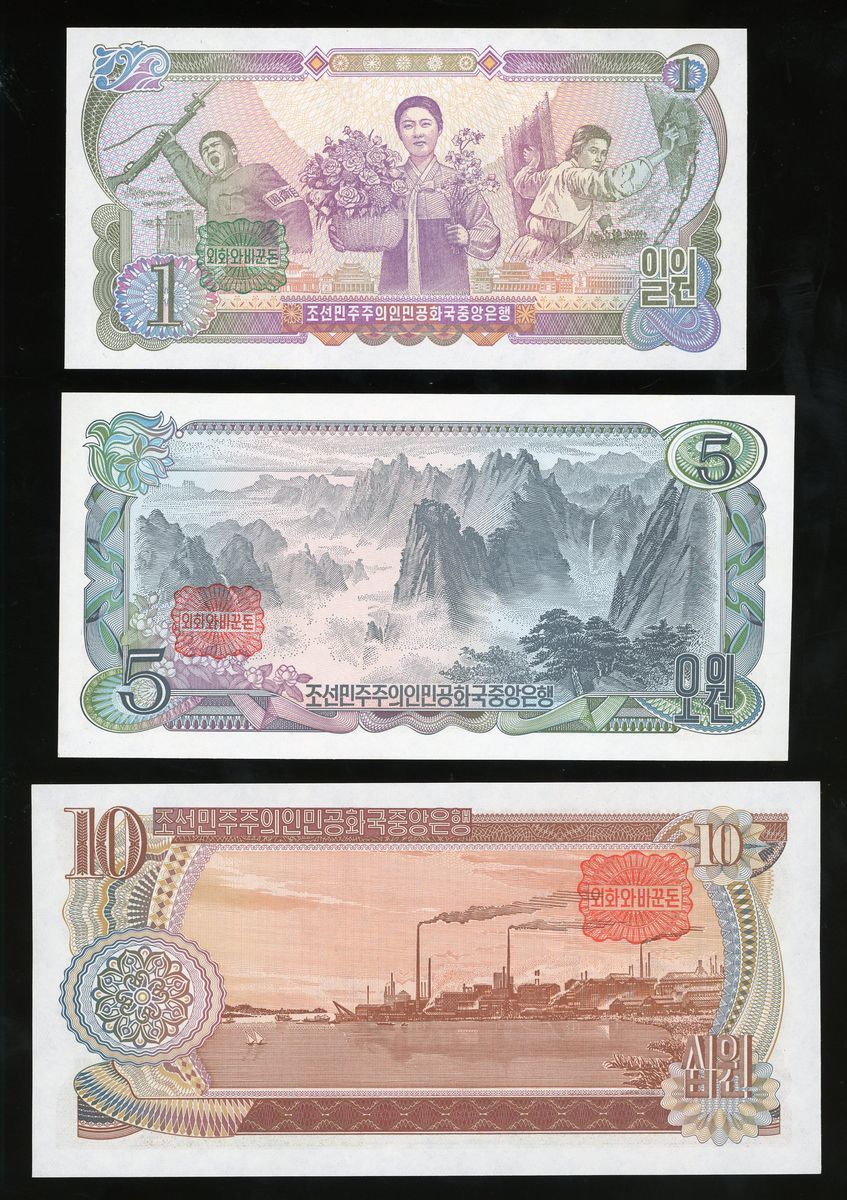 Central Bank of the Democratic Peoples Republic of Korea, a group of 5, including: 1 won, 5 won, 10 won, 50 won and 100 won, 1978, serial numbers 558989, 328289, 822889, 854989 and 653189 respectively,