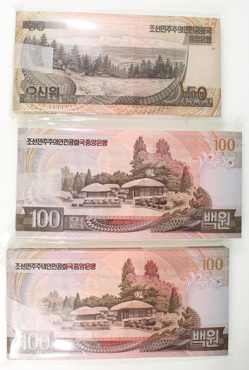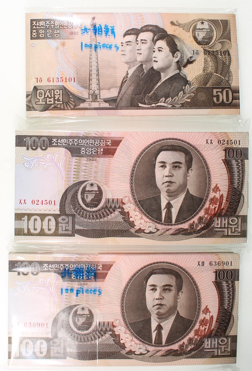 North Korea, a group of 3 consecutive run of 100 notes, consists of 1 bundle of 50 won and 2 bundles of 100 won, 1992, serial numbers 6135101-200, 636901-7000 and 024501-600, (Pick 42 and 43), all uncirculated, mild toning spots at 50 won edges, sold as seen no return (300).