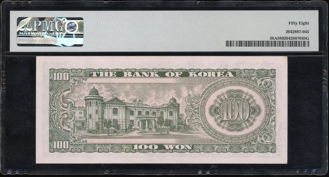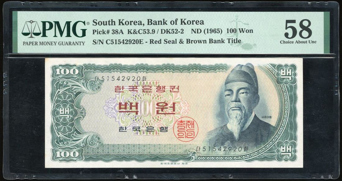 Bank of Korea, South Korea, 100 won, ND (1965), serial number C51542920E, (Pick 38A), PMG 58 Choice About Uncirculated