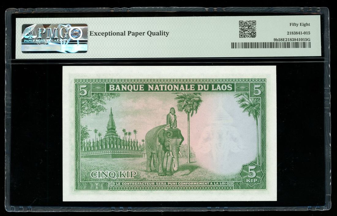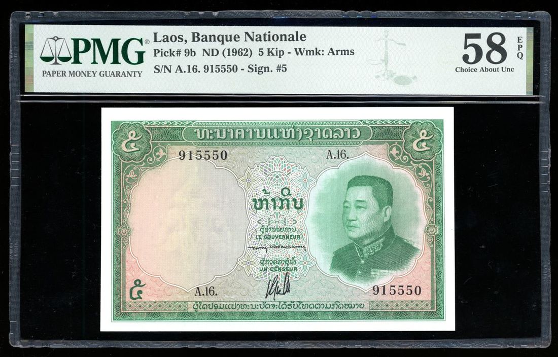 Banque Nationale du Laos, 5 kip, ND (1962), serial number A.16. 915550, (Pick 9b), PMG 58EPQ Choice About Uncirculated