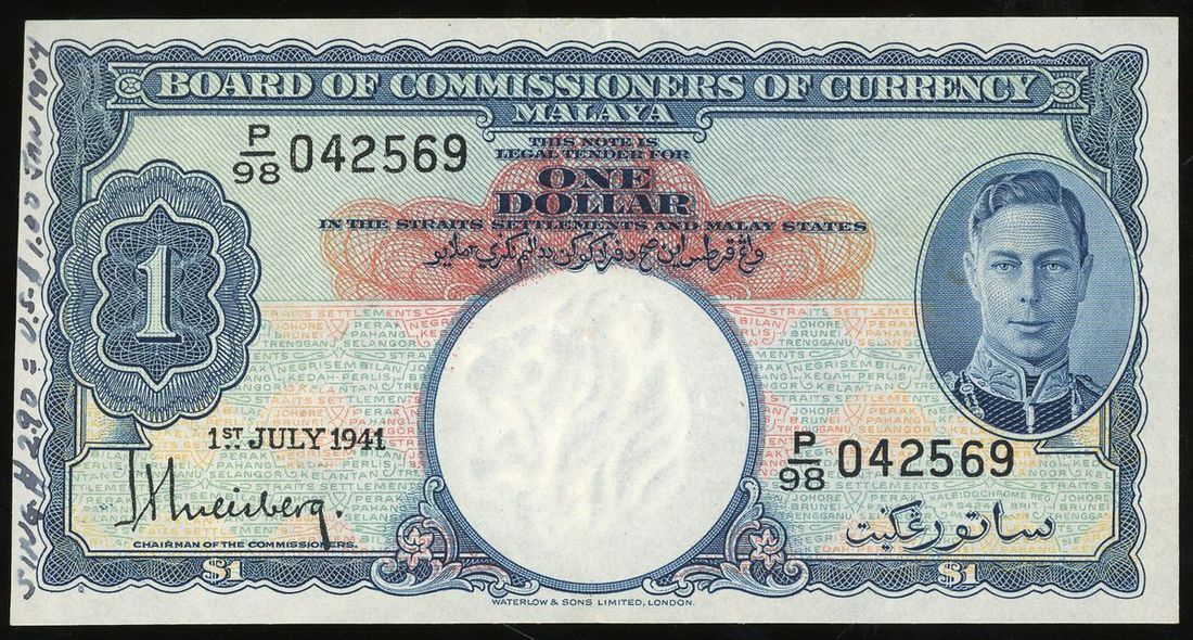 Board of Commissioners of Currency, Malaya, $1, 1941, serial number P/98 042569, (Pick 11), uncirculated, ink annotation at obverse left.