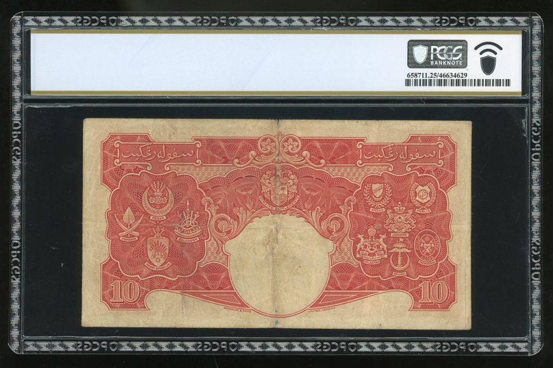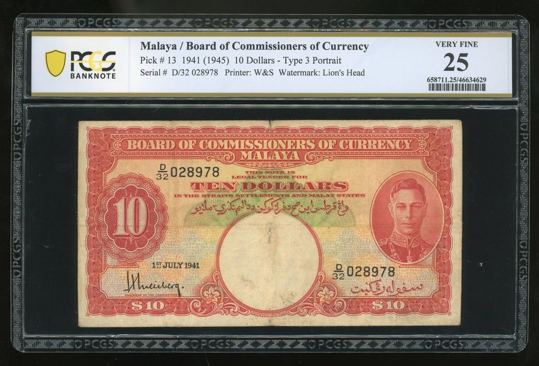 Board of Commissioners of Currency, Malaya, $10, 1941 (1945), serial number D/3 028978, (Pick 13), PCGS 25 Very Fine