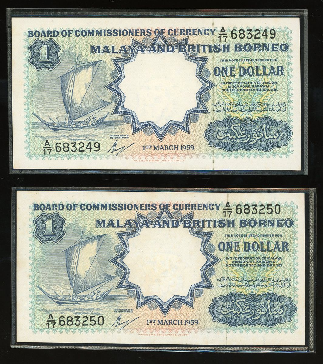 Board of Commissioners of Currency, Malaya and British Borneo, a pair of $1, 1959, consecutive serial numbers A/17 683249-250, printer Waterlow,