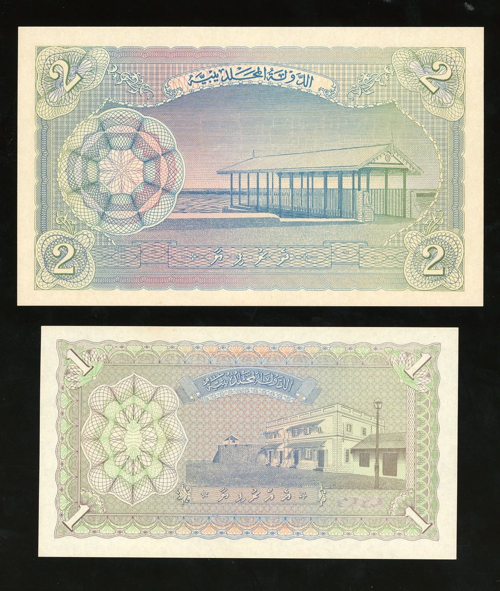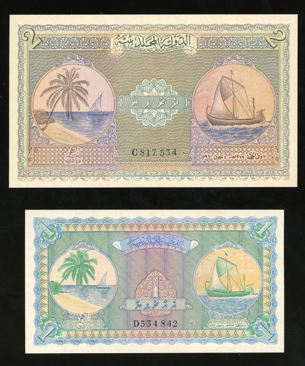 Maldives, a pair of 1 rupee and 2 rupees, 1960, serial numbers D534842 and C817534, (Pick 2b and 3b), both uncirculated with mild foxing (2)