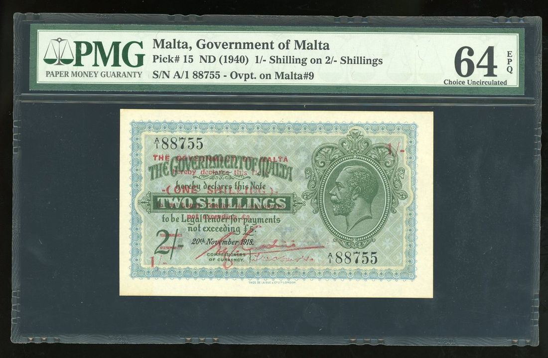 Government of Malta, one shilling overprint on two shillings, ND (1940), serial number A/1 88755, (Pick 15), PMG 64EPQ Choice Uncirculated, quite scarce in this grade