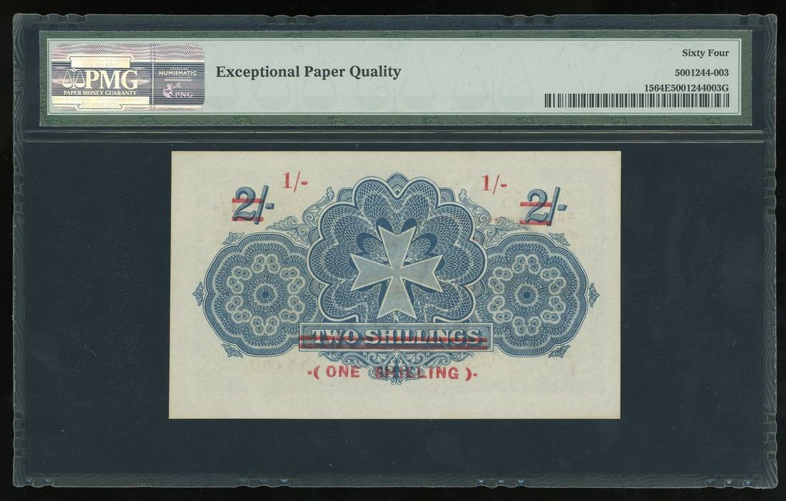 1940年馬爾他1先令加蓋2先令, 編號 A/1 88755. PMG 64EPQ, 罕見高分美品