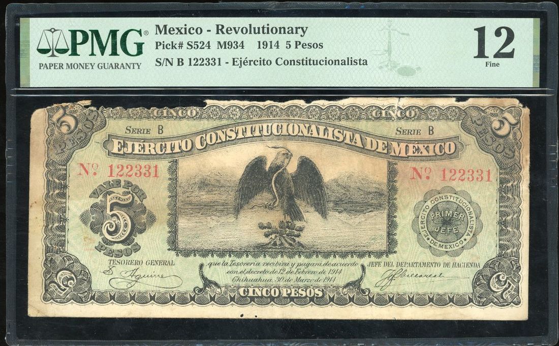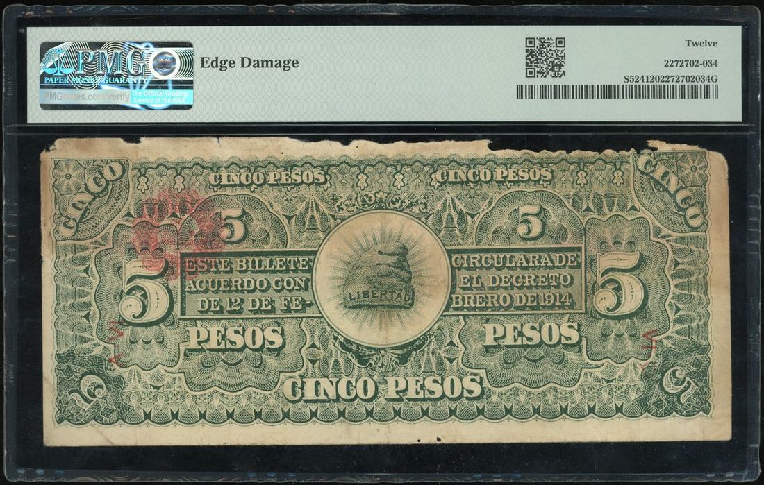 Ejercito Constitucionalista de Mexico, 5 pesos, 1914, serial number B122331, (Pick S524), PMG 12, edge damage