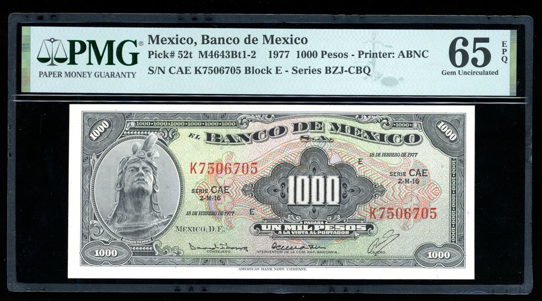 Banco de Mexico, 1000 pesos, 1977, serial number CAE K7506705, (Pick 52t), PMG 65EPQ Gem Uncirculated
