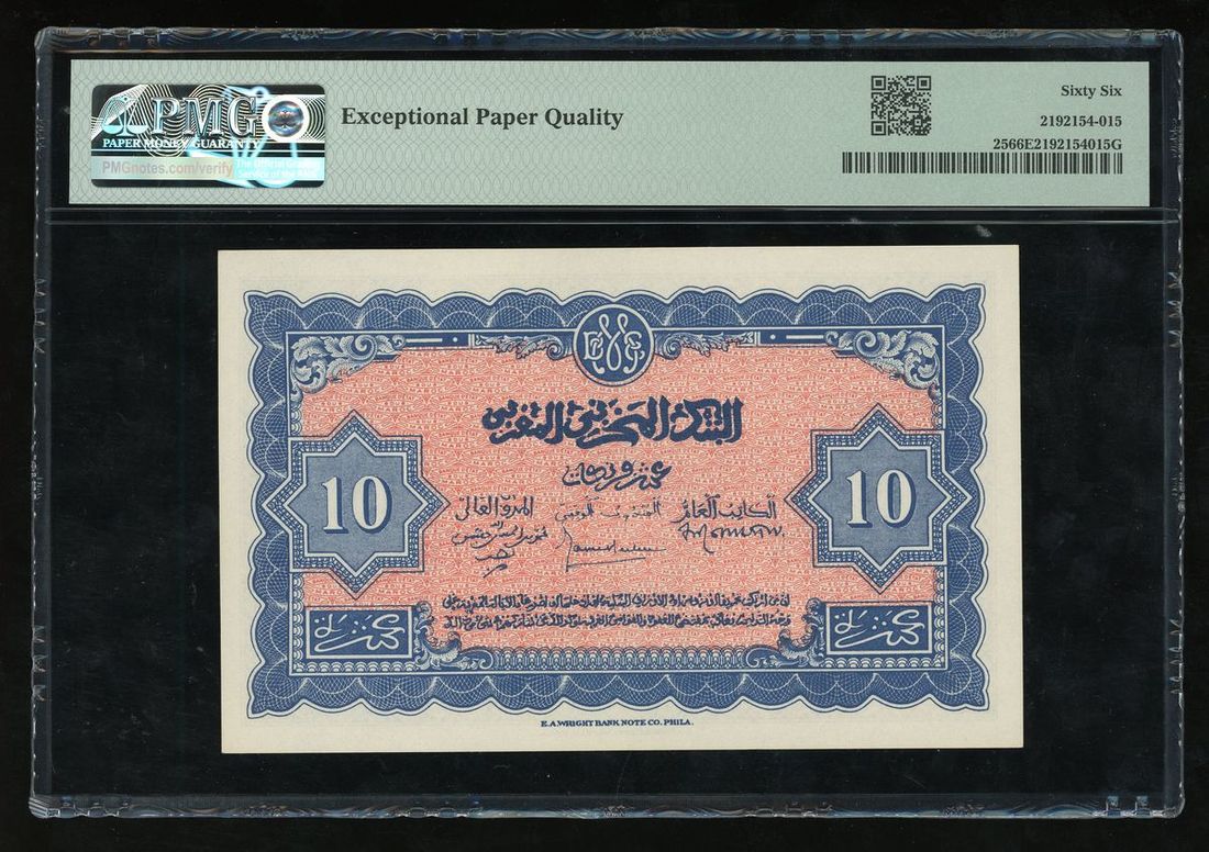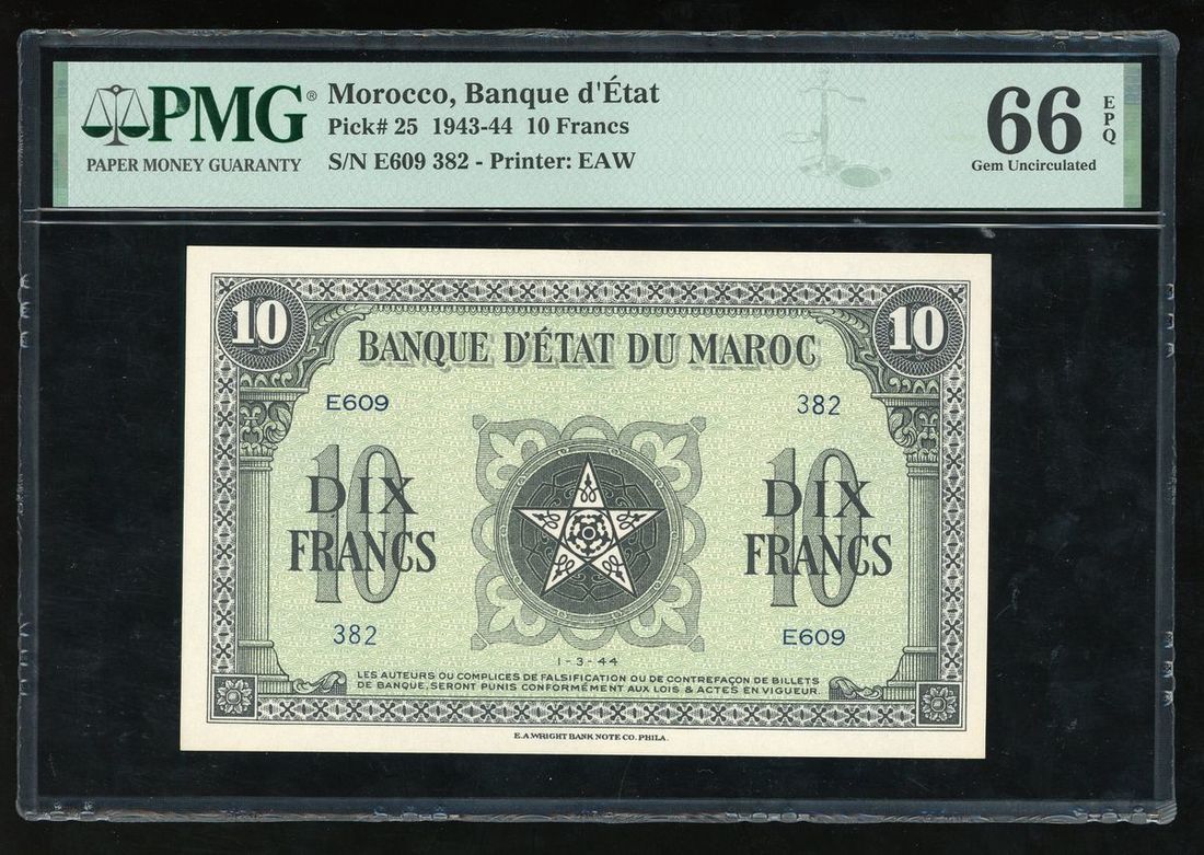 Banque d'etat du Maroc, Morocco, 10 francs, 1944, serial number E609 382, (Pick 25), PMG 66EPQ. PMG Census second highest grade, with only 4 better