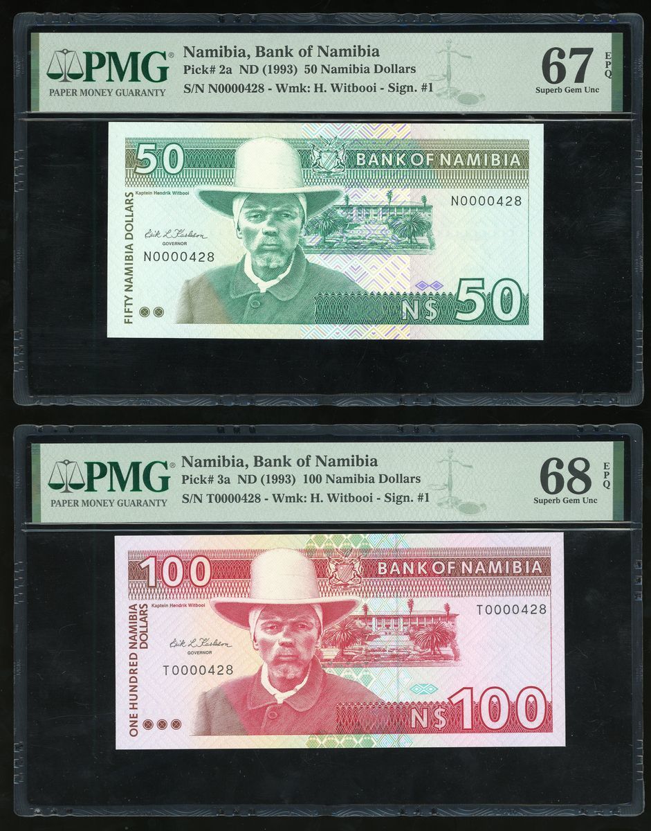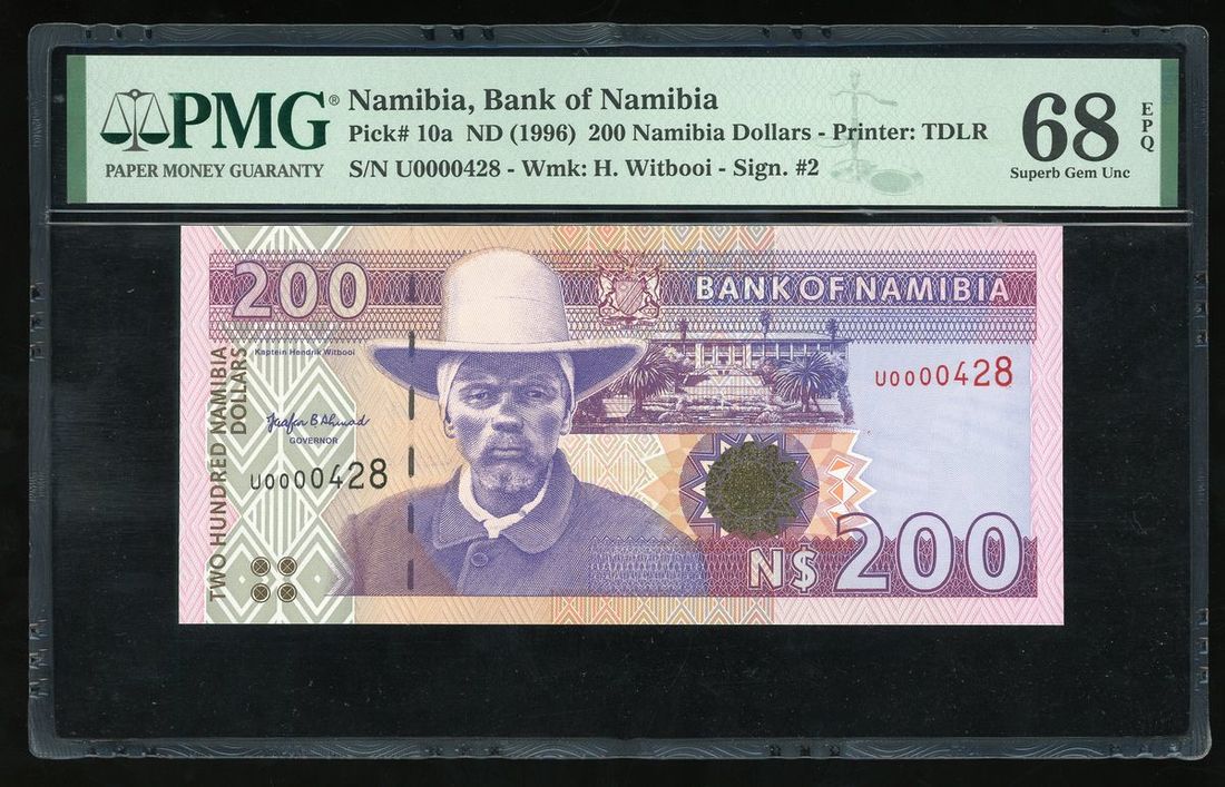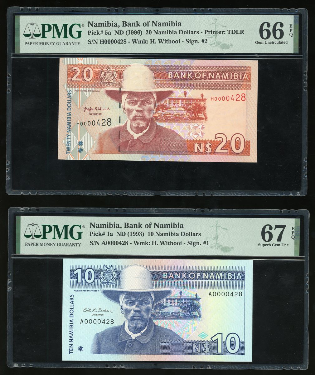 Bank of Namibia, set of matching serial number, 1993-96, including 10, 20, 50, 100 and 200 Namibia Dollar, serial number 0000428, (Pick 1a, 2a, 3a, 5a, 10a), PMG 66EPQ to 68EPQ (5)