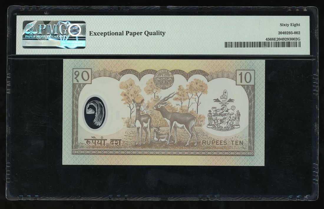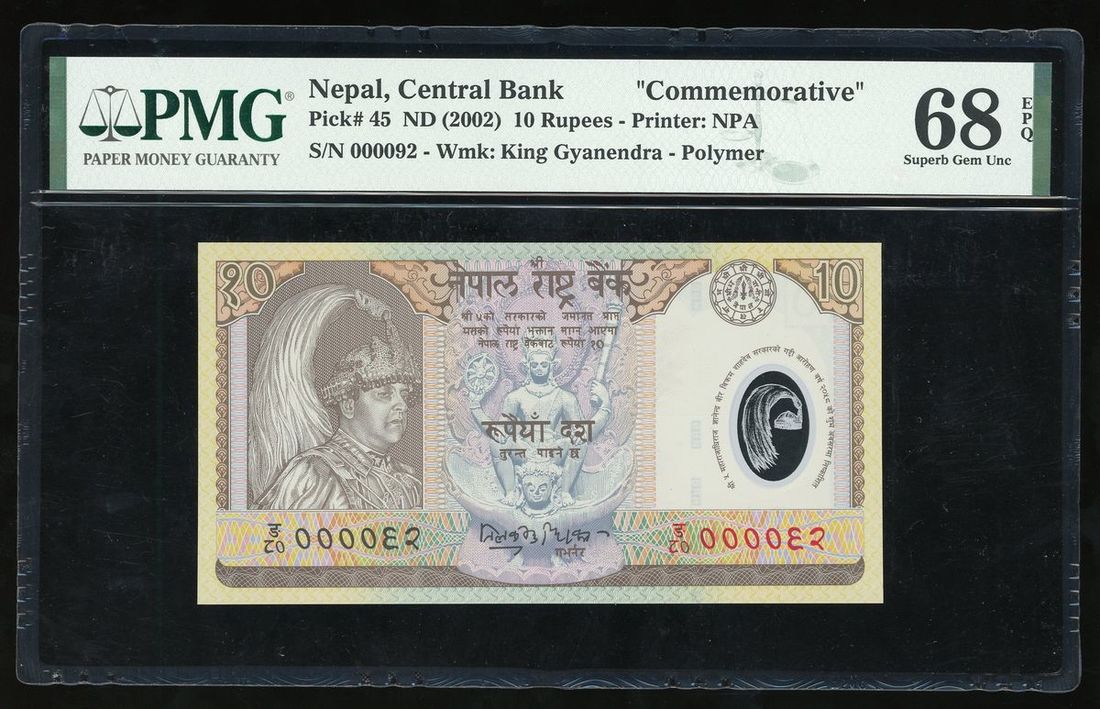 Central Bank of Nepal, polymer 10 rupees, ND (2002), serial number 000092, (Pick 45), PMG 68EPQ. Low serial