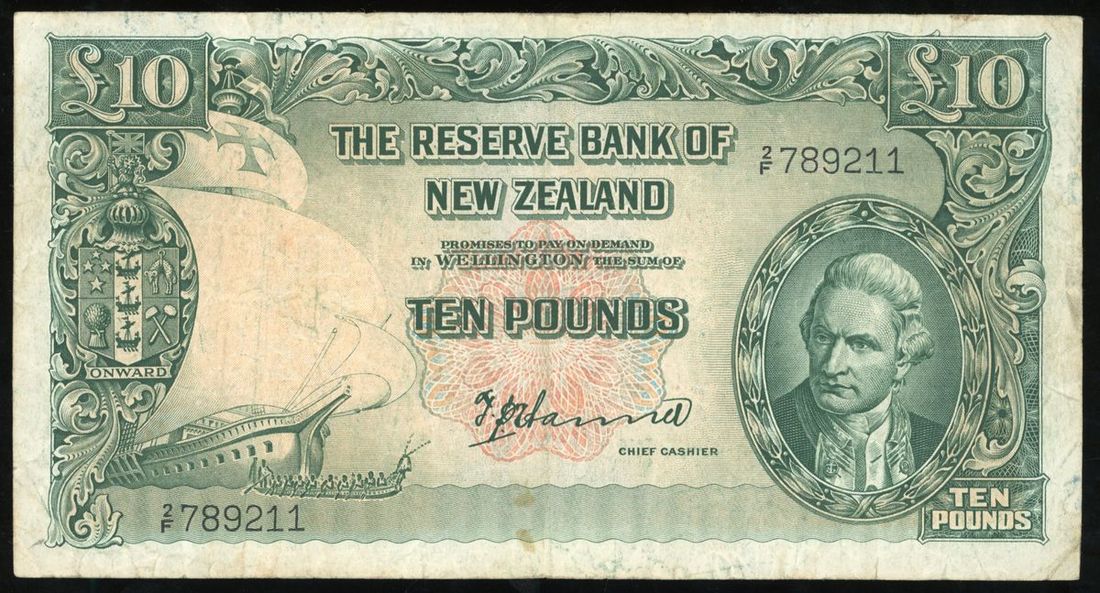 1940-67年紐西蘭10鎊, 編號 2F 789211, F品相. 建議預覽, 原況出售,概不退換