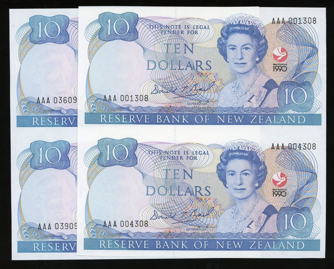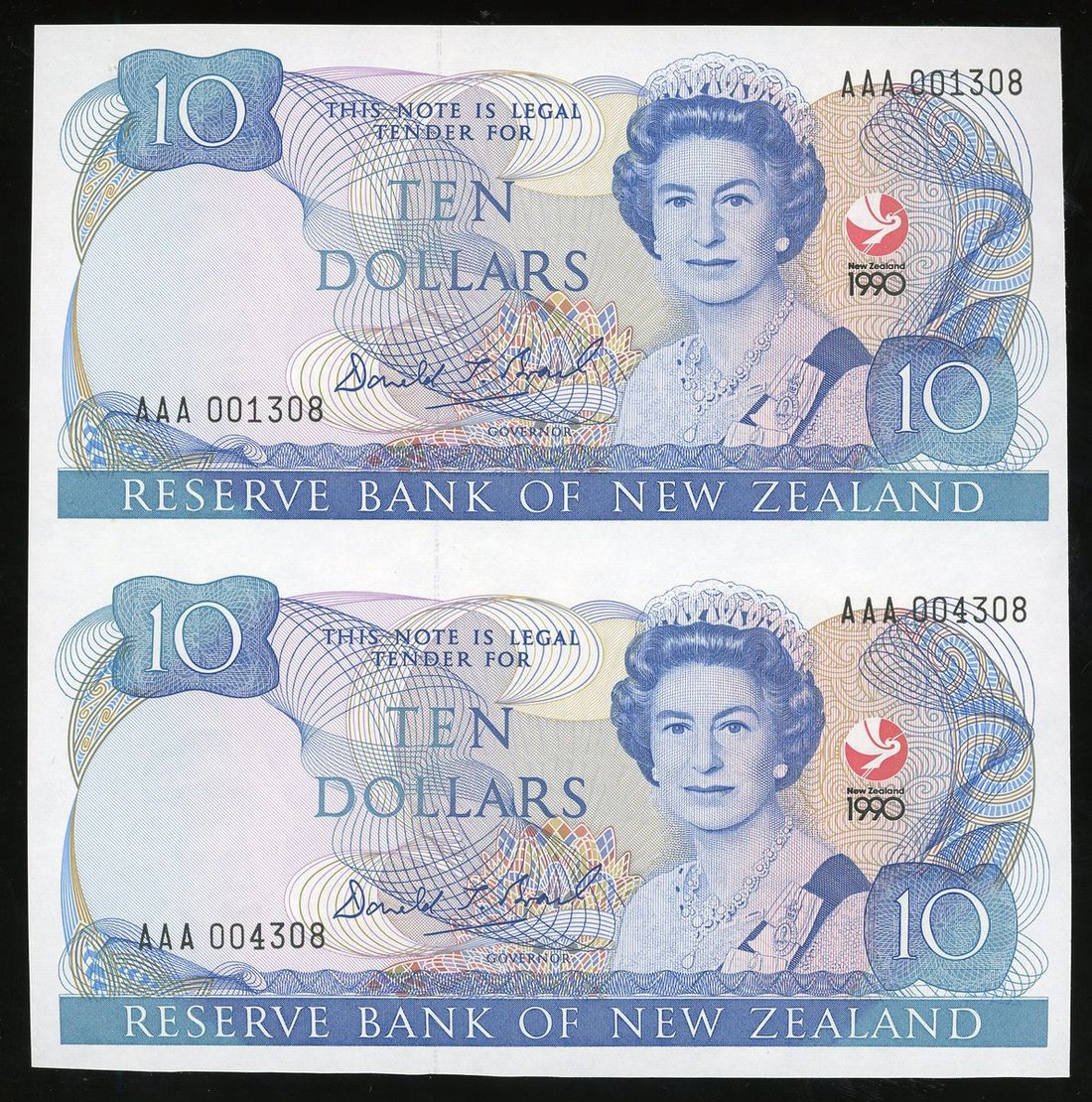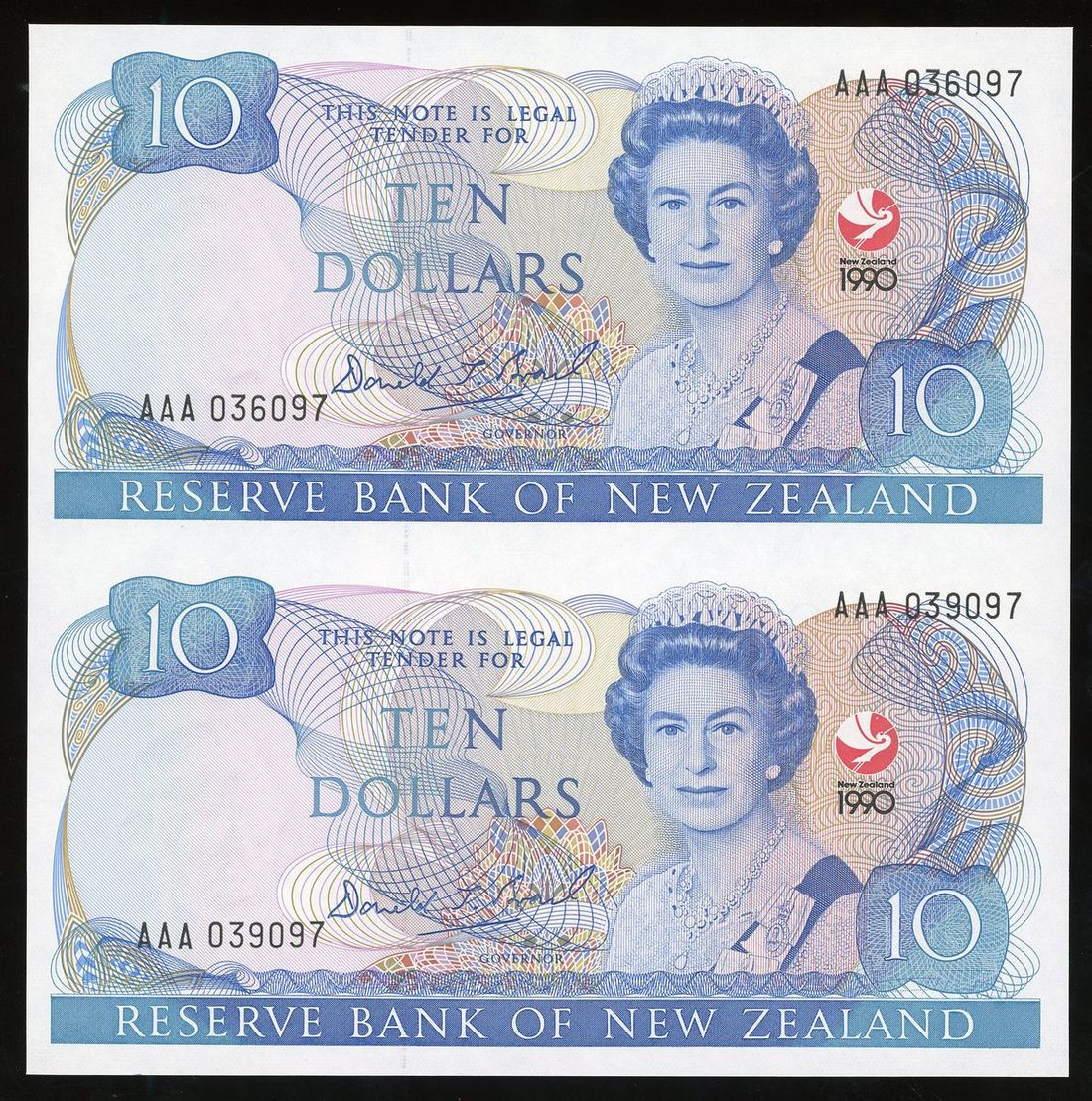 1990年紐西蘭10元連體鈔, 編號 AAA 001308/004308, 036097/039097. UNC品相