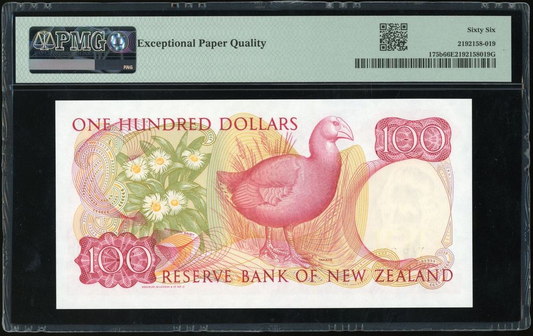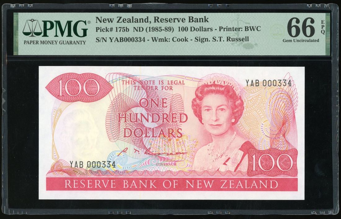1985-89年紐西蘭100元, 編號 YAB000334. PMG 66EPQ