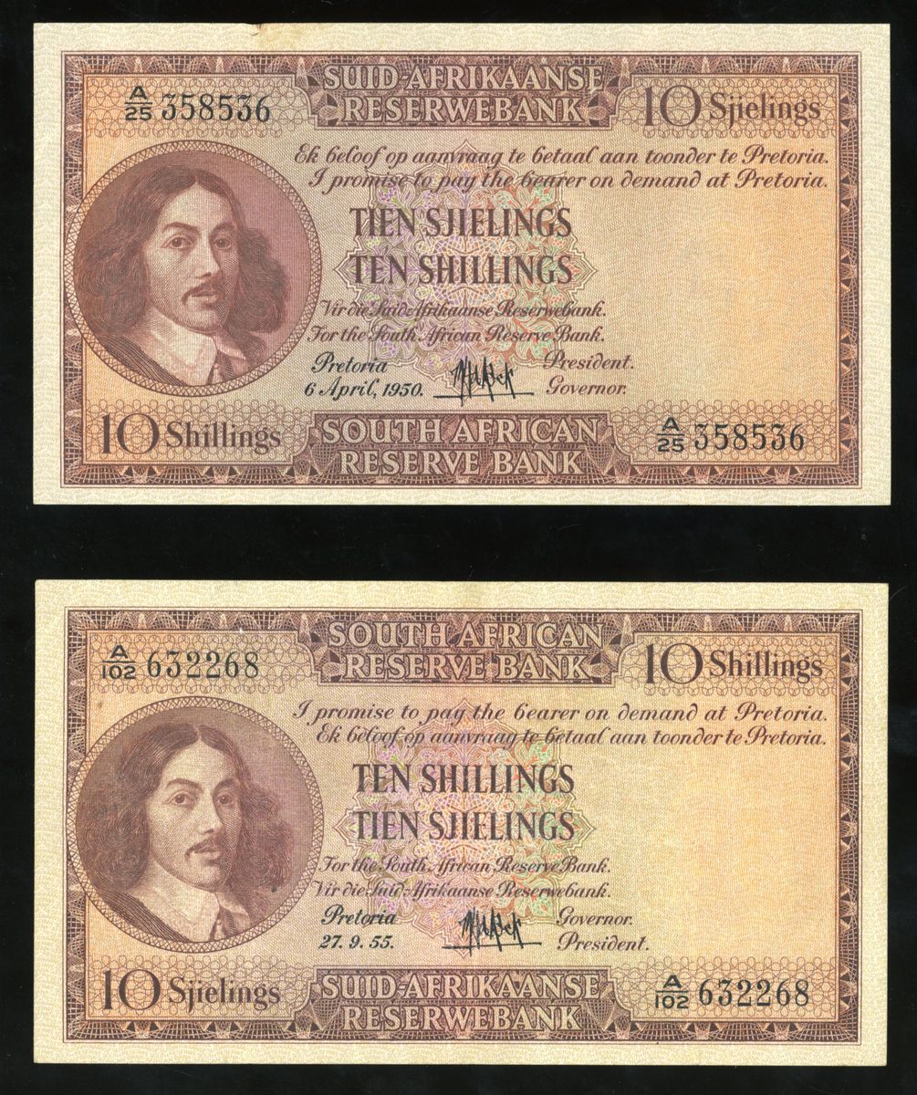 South Africa, Reserve Bank, a pair of 10 shillings, 1950 and 1955, serial numbers A/25 358536 and A/102 632268, (Pick 91c and 90c), both extremely fine, viewing recommended, sold as seen no return (2).