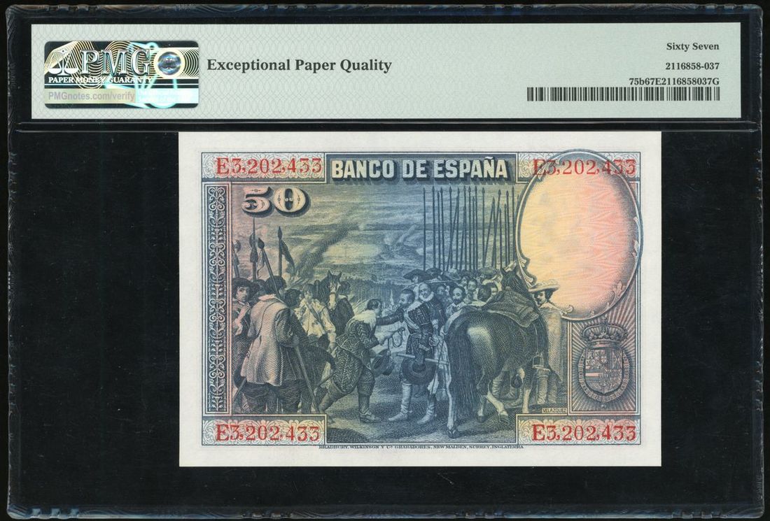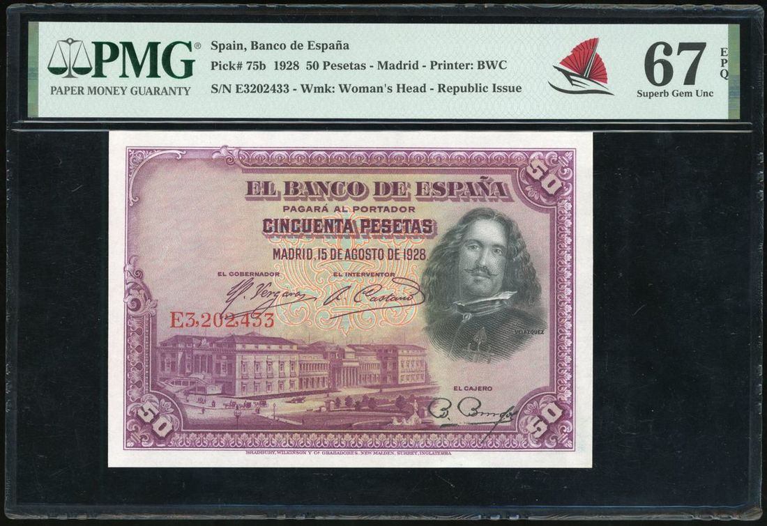 Spain, Banco de Espana, 50 pesetas, 1928, serial number E3202433, (Pick 75b), PMG 67EPQ Superb Gem Uncirculated.