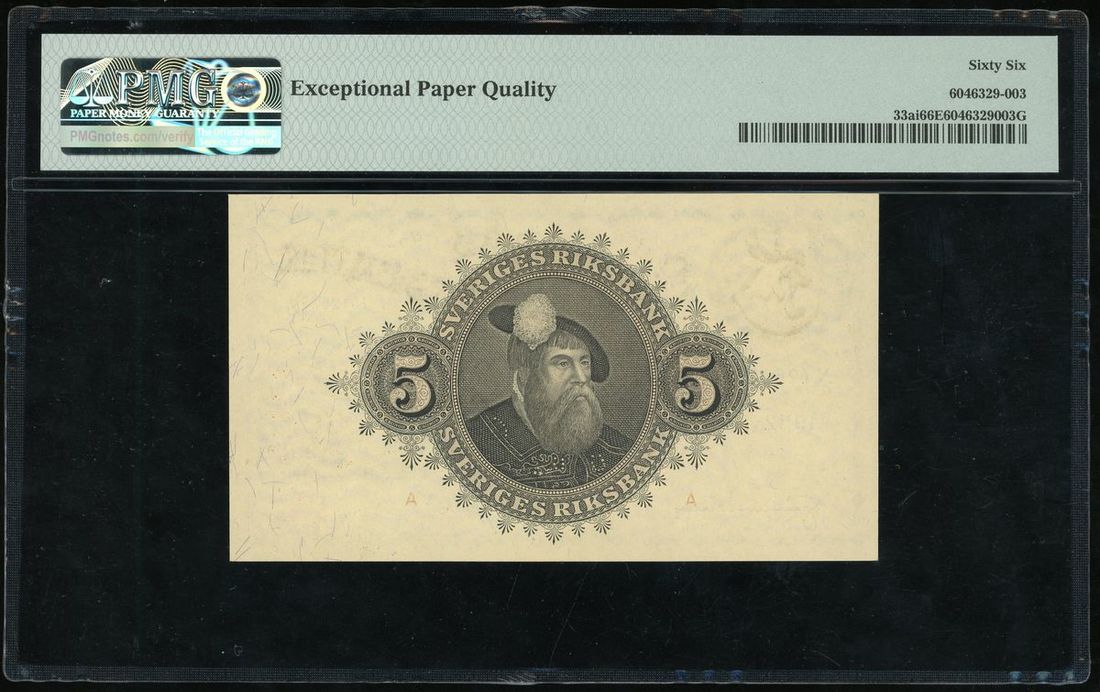 Sweden, Sveriges Riksbank, 5 kronor, 1952, serial number N126254, (Pick 33ai), PMG 66EPQ Gem Uncirculated.