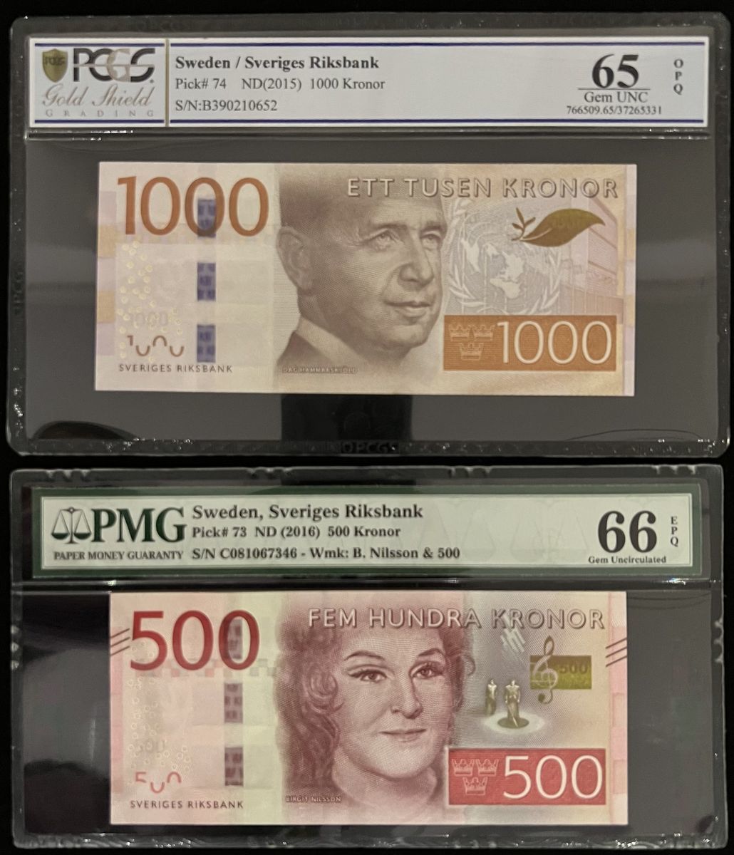 瑞典一組兩枚, 500 及 1000 克朗, 2015/2016, 編號 B390210652, C081067346. PMG 66EPQ, PCGS 65OPQ