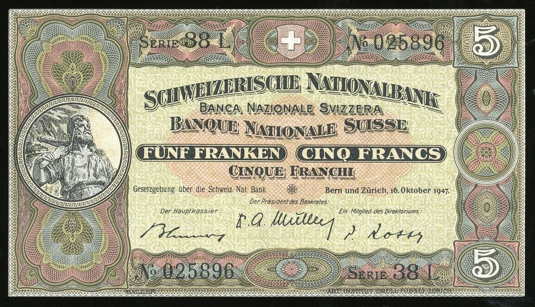 Banque Nationale Suiss, Switzerland, 5 franken, 1947, serial number 025896, (Pick 11m(2)), uncirculated.