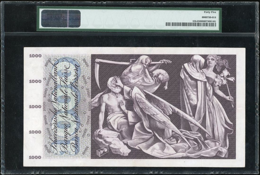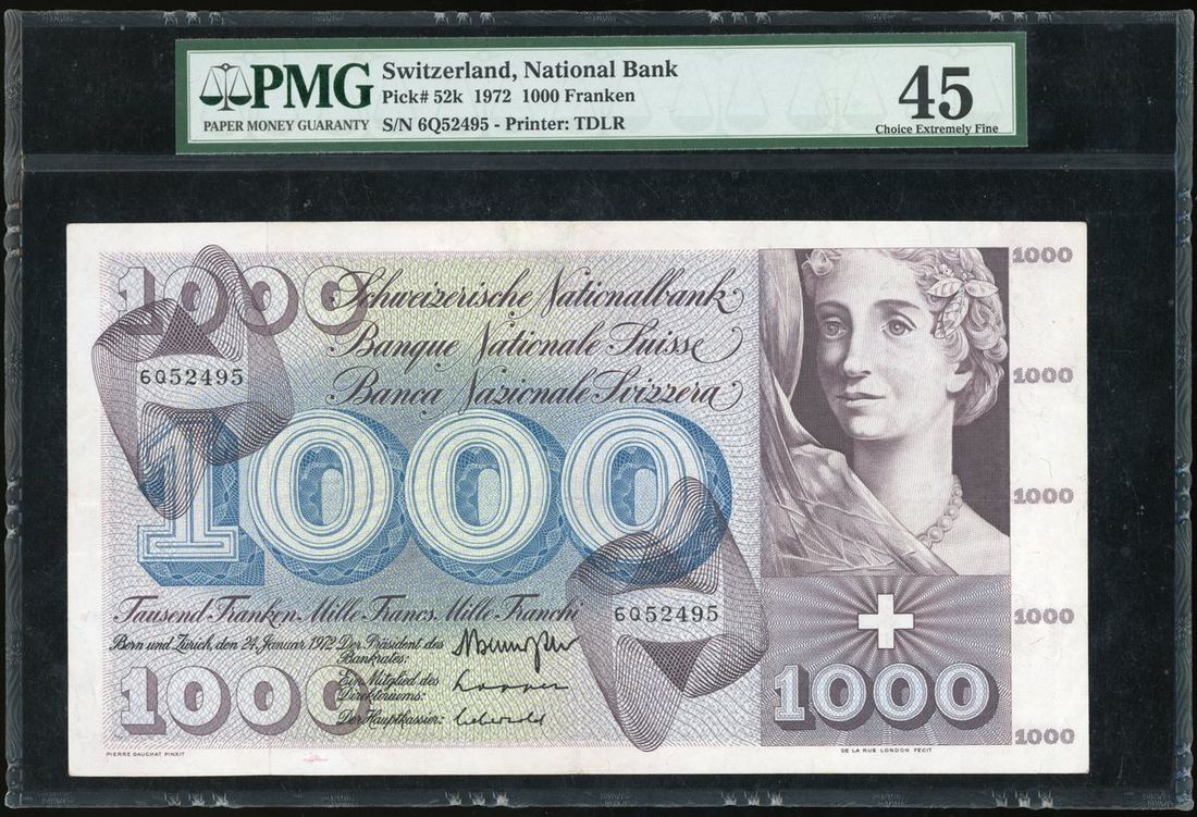 Switzerland, National Bank, 1000 franken, 1972, serial number 6Q52495, (Pick 52k), PMG 45 Choice Extremely Fine.
