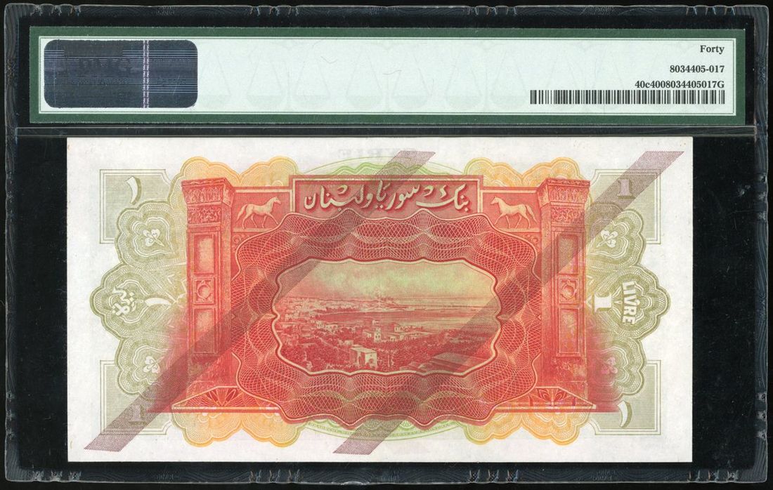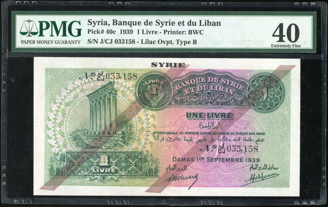 1939年敘利亞1livre, 編號 J/CJ 033158, B版別加蓋, PMG 40