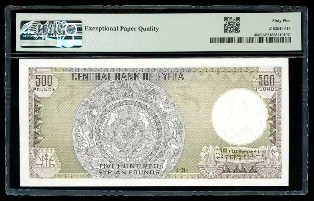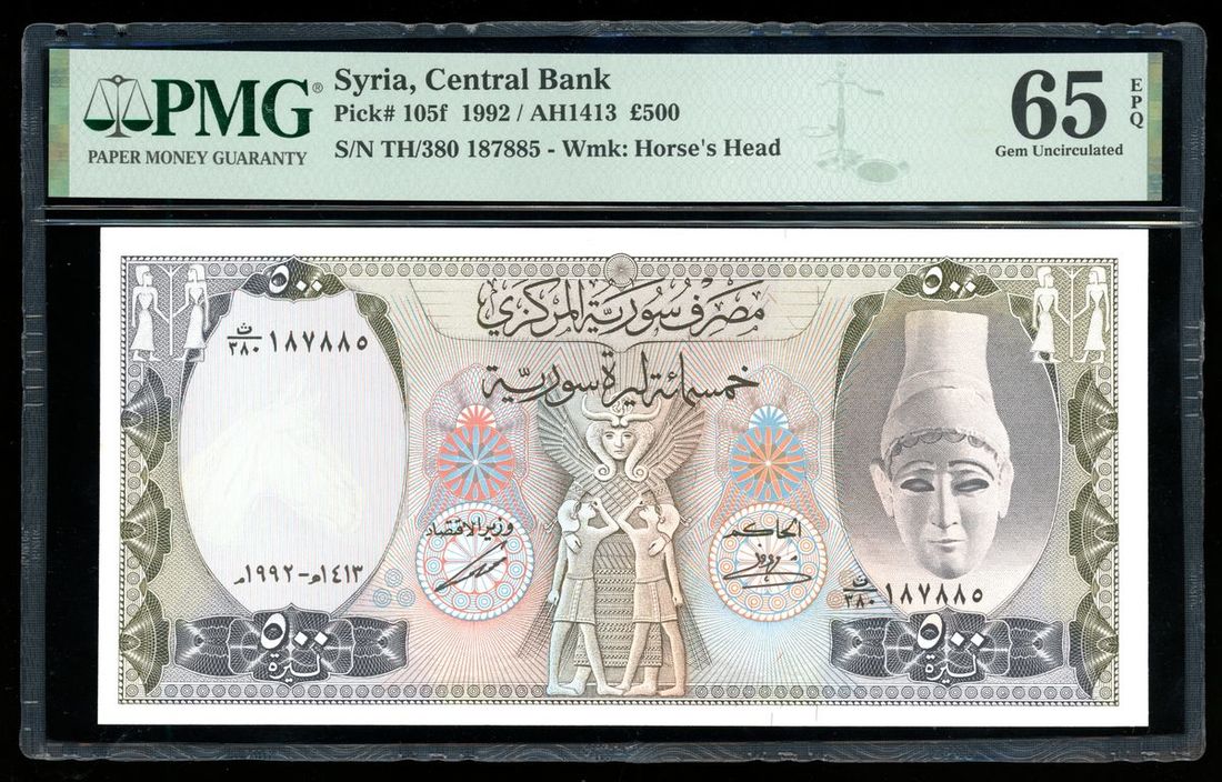 Central Bank of Syria, 500 pounds, AH1413 (1992), serial number TH/380 187885, (Pick 105f), PMG 65EPQ Gem Uncirculated