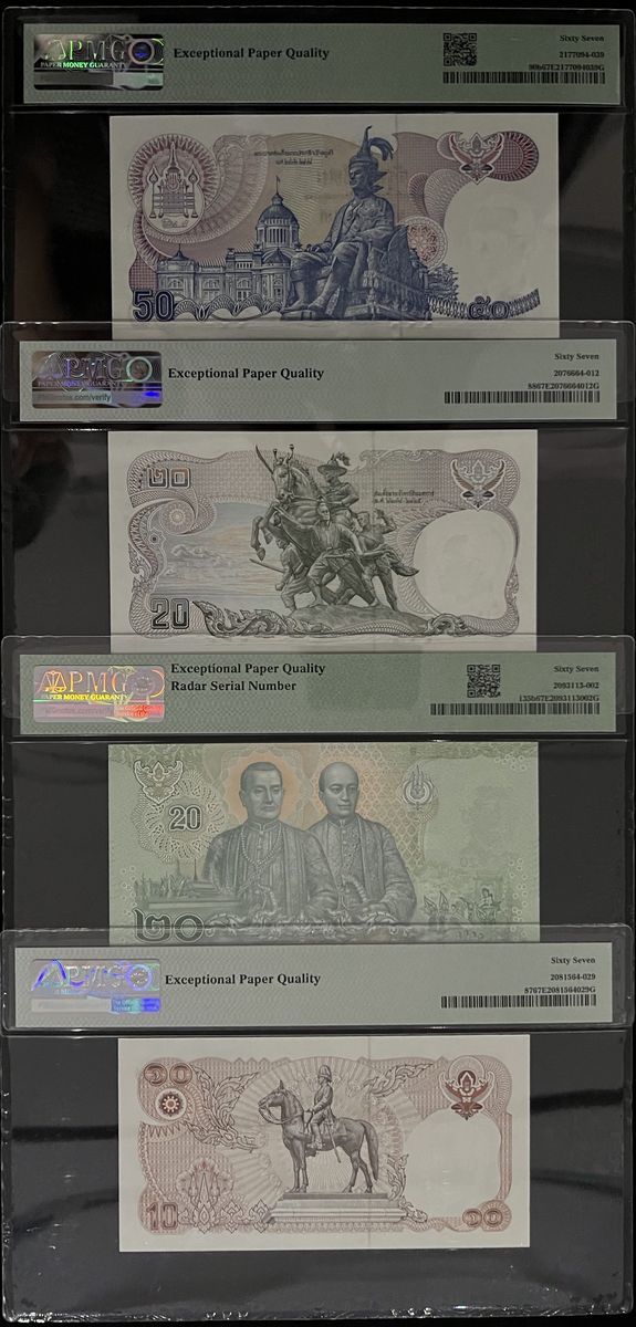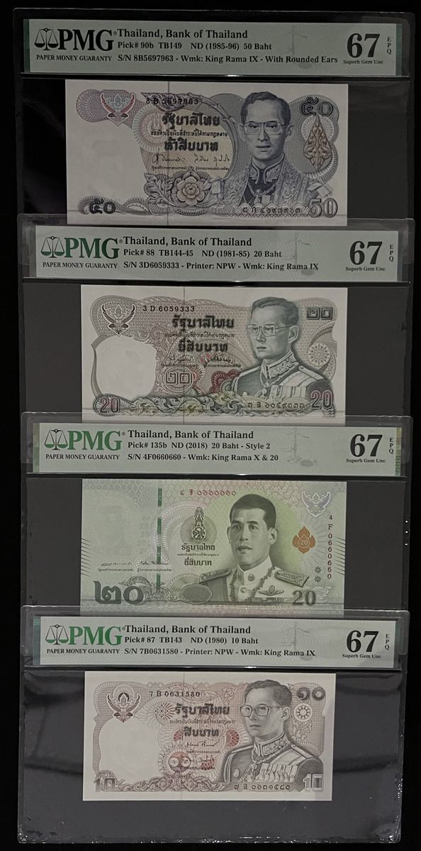 Bank of Thailand, a group of 4 notes, consists of 10 baht, no date (1980), a pair of 20 baht, no date (1981-85 and 2018) and 50 baht, no date(1986-96), serial numbers 7B0631580, 3D6059333, 4F0660660(radar number) and 8B5697963, (Pick 87, 88, 135b and 90b), all graded PMG 67EPQ Superb Gem Uncirculated (4).