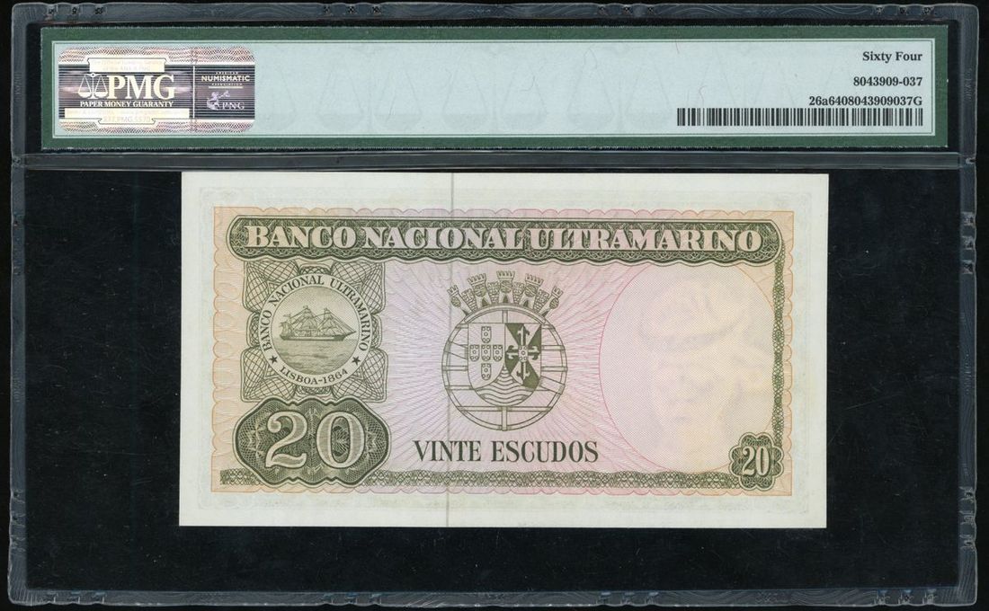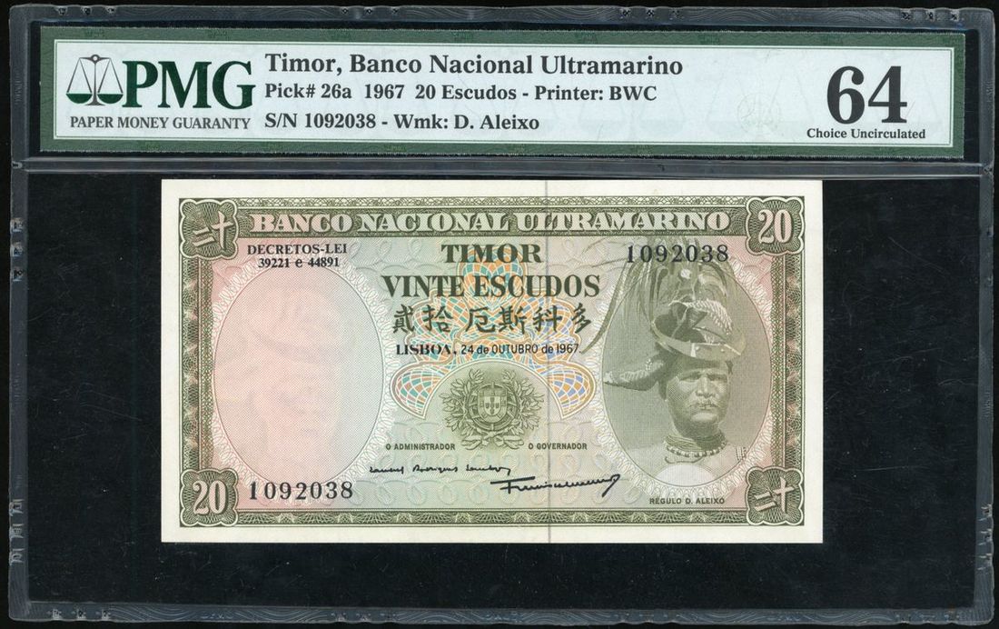 Banco Nacional Ultramarino, Timor, 20 escudos, 1967, serial number 1092038, (Pick 26a), PMG 64.