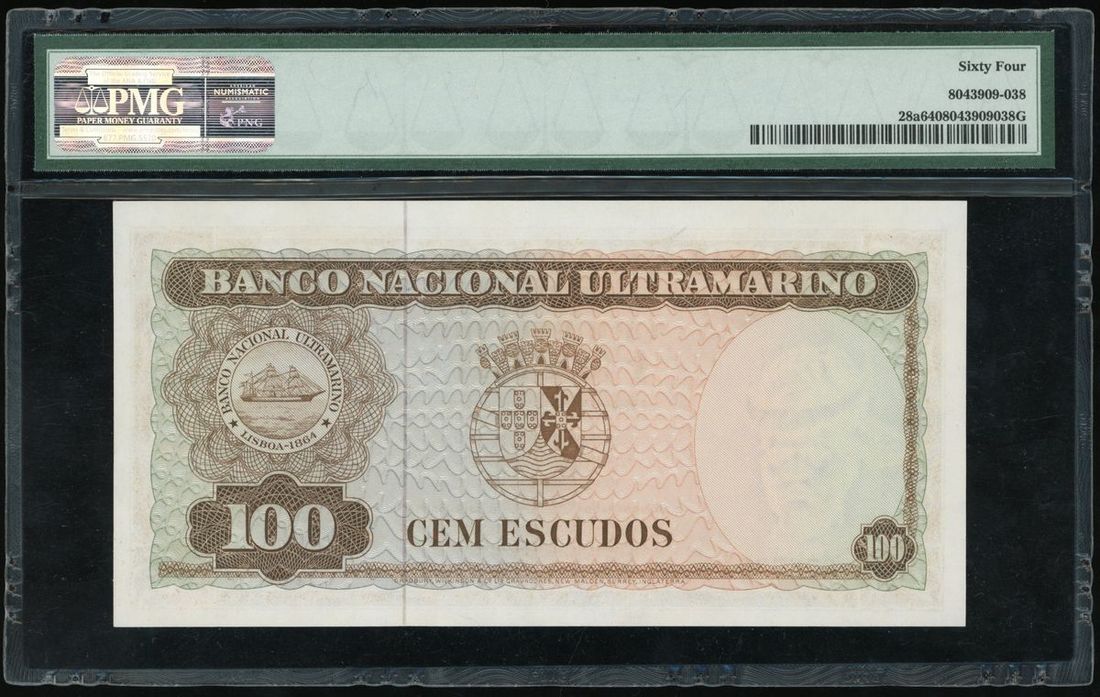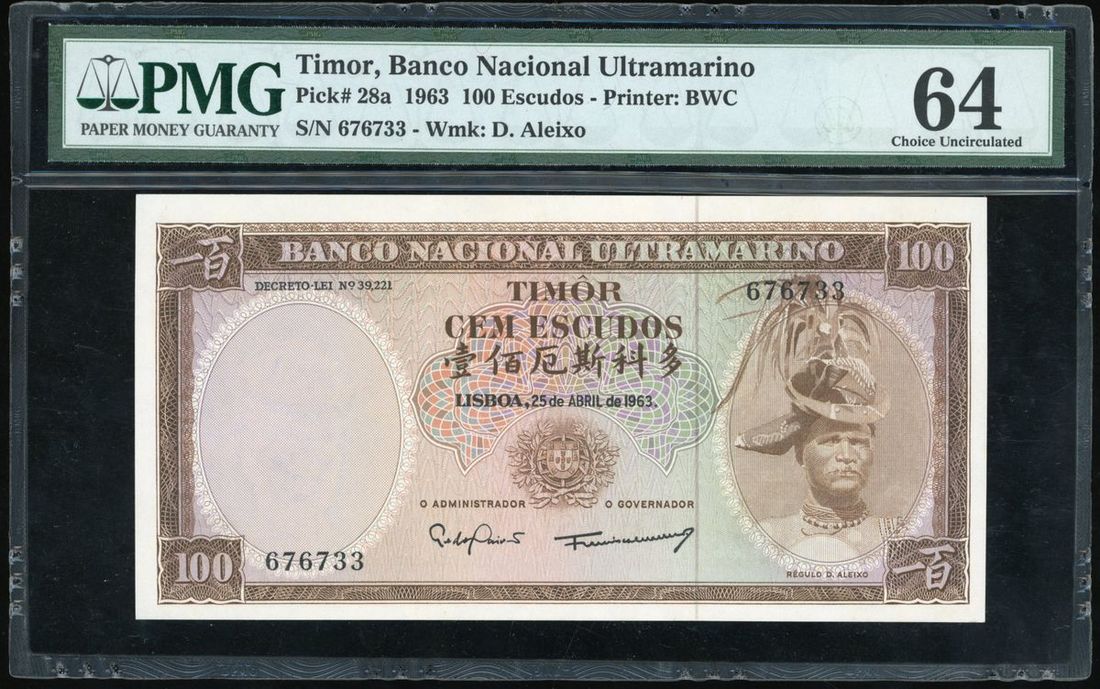 Timor, 100 escudos, 1963, serial number 676733, (Pick 28a), PMG 64.