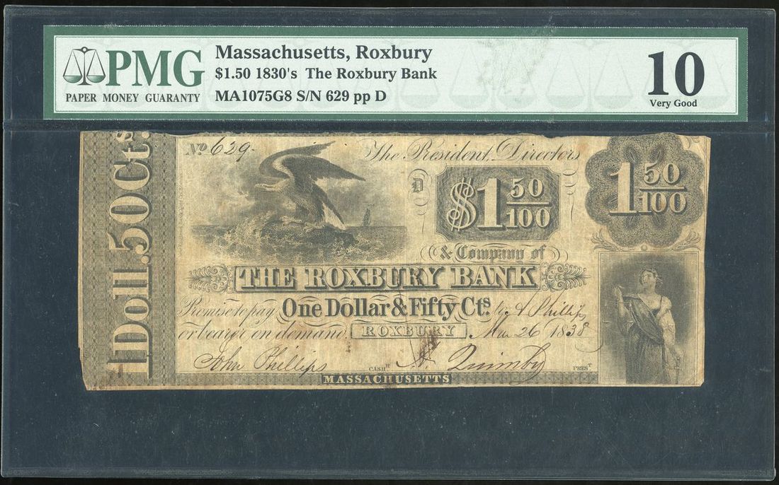 United States, Massachusetts, Roxbury, $1.5, 1838, serial number MA1075G8, black, eagle at top left, handsigned signatures at bottom left and right,