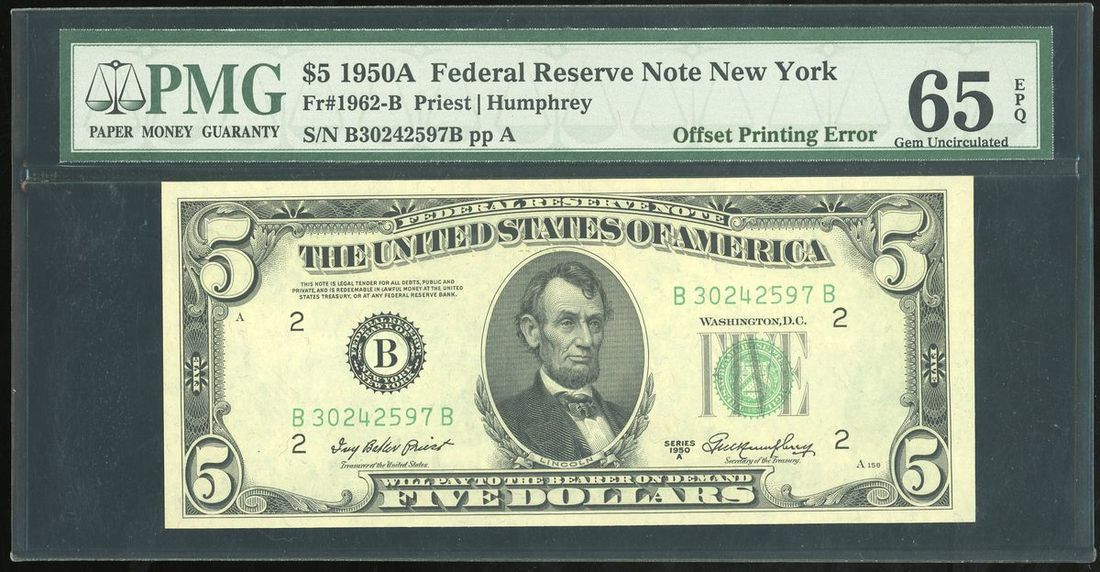 United States, ERROR $5, 1950A, serial number B30242597B, offset printing error on reverse,