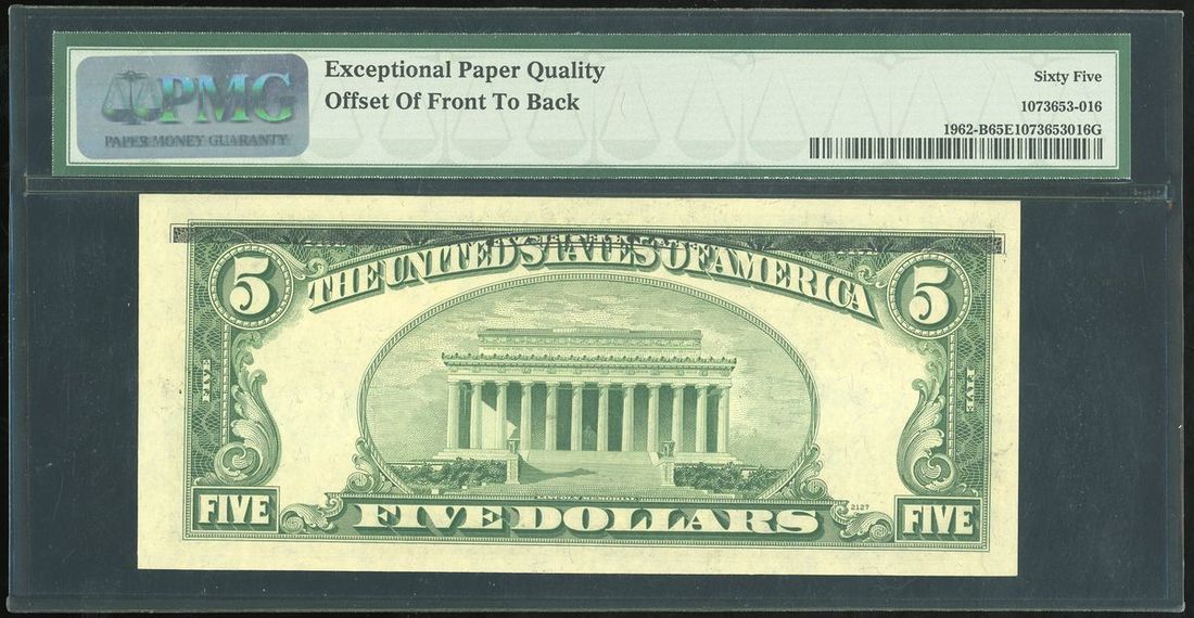 1950A美國5元錯體, 編號 B30242597B, 正面圖案重疊於背面, PMG 65EPQ