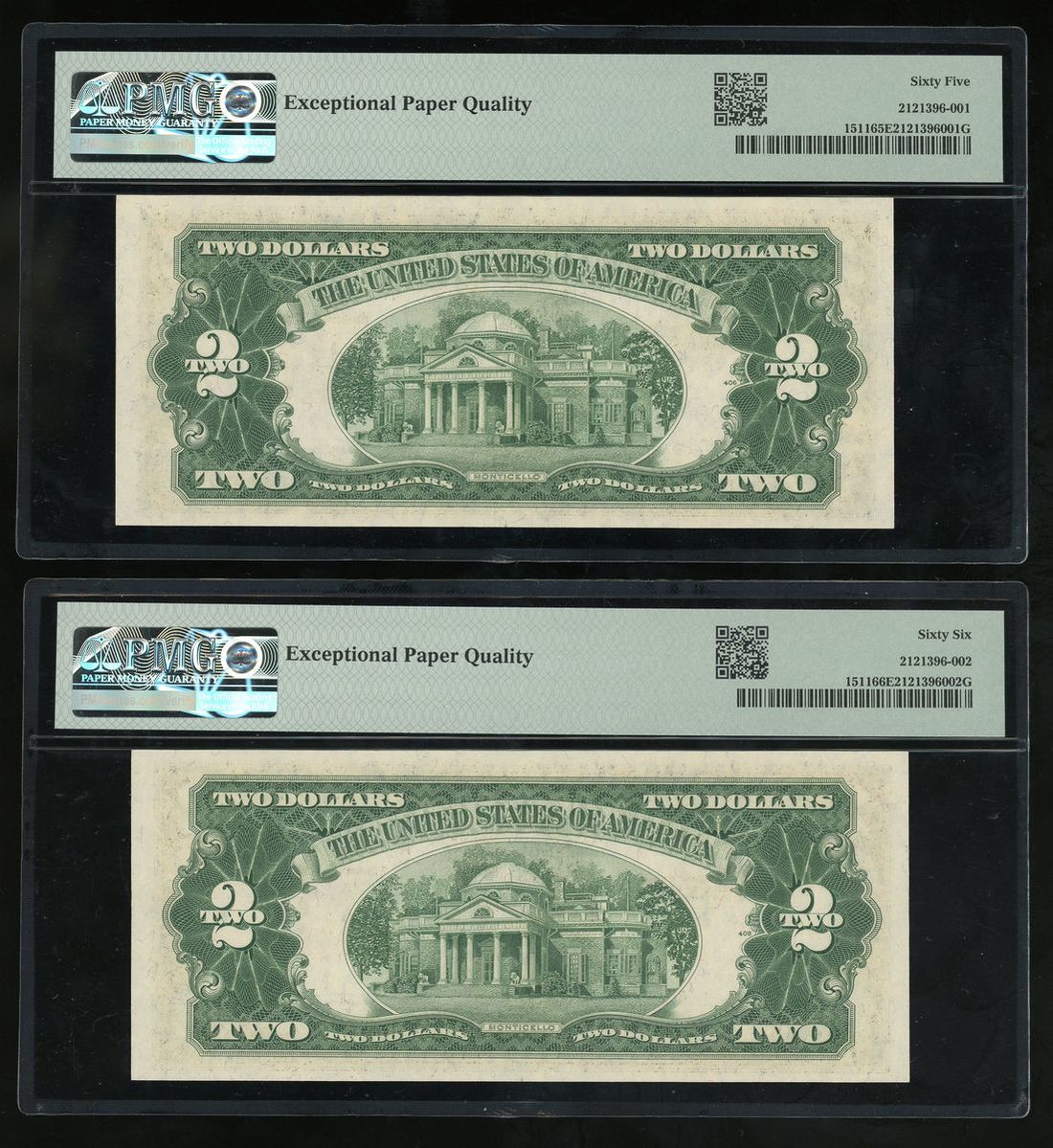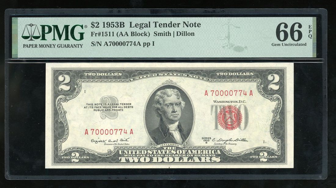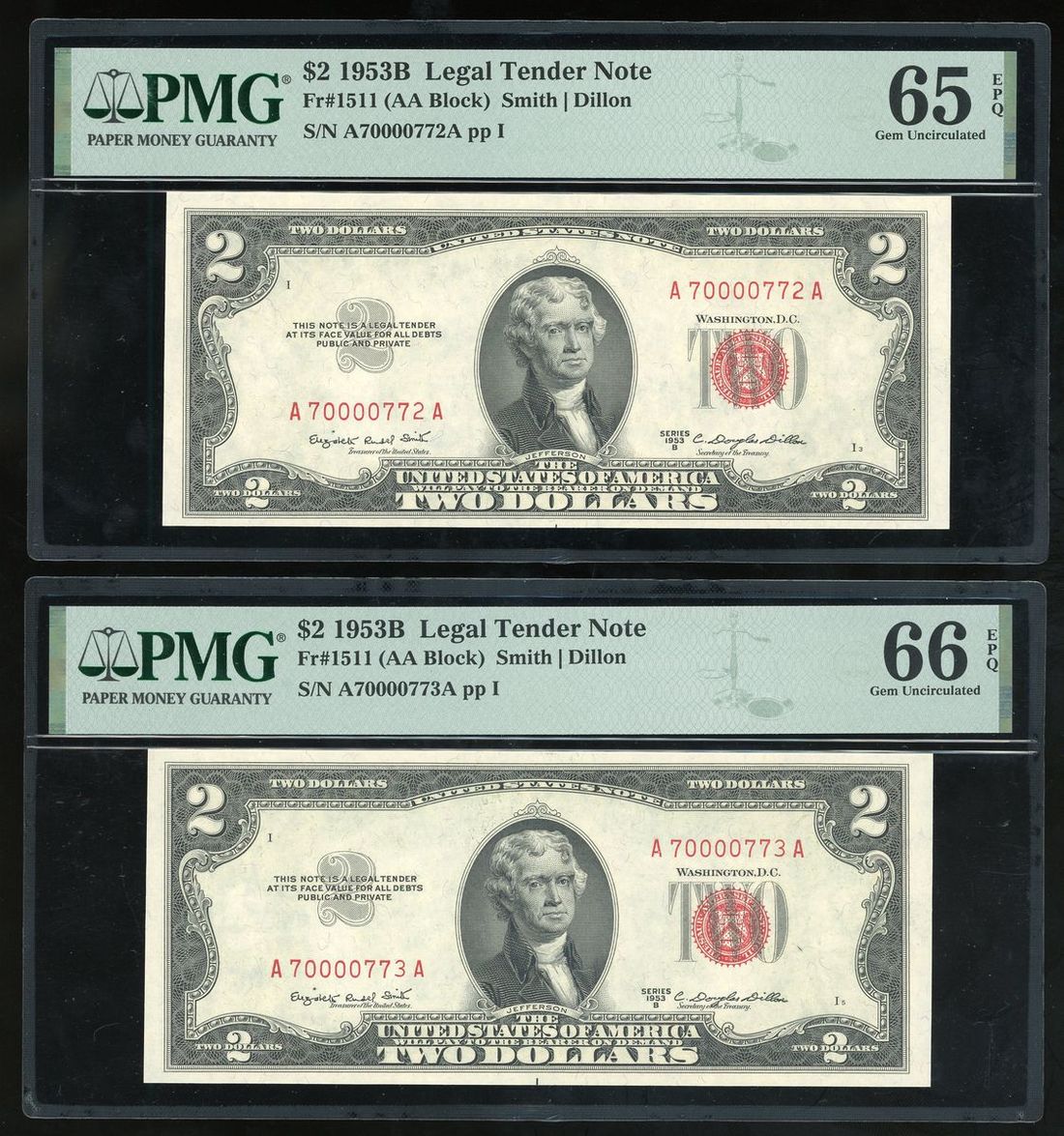 1953B美國一組三枚連號2元, 編號 A70000772A-774A ppI, PMG 65EPQ, 66EPQ, 66EPQ